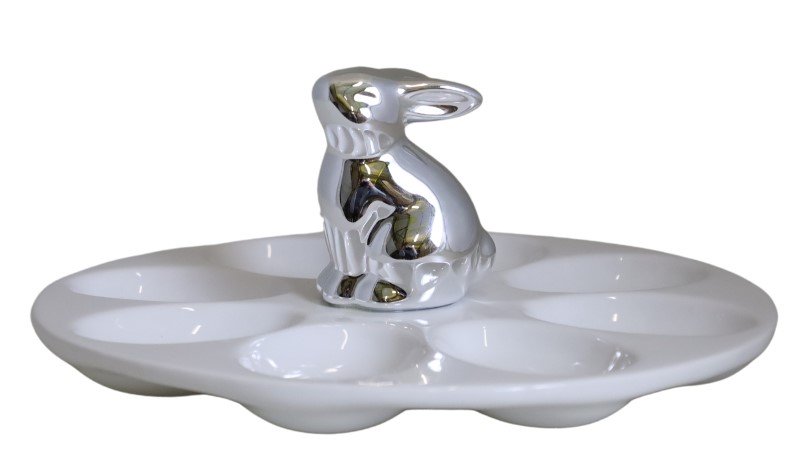 Talerz na jajka biały ze srebrnym królikiem GOTA