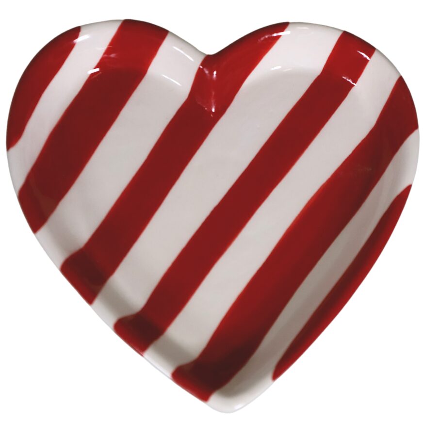 Talerzyk VALENTINA to mała ceramiczna dekoracja w kształcie serca, ozdobiona biało-czerwonymi paskami. Idealny na drobne słodkości, biżuterię lub jako stylowy akcent w walentynkowej aranżacji.