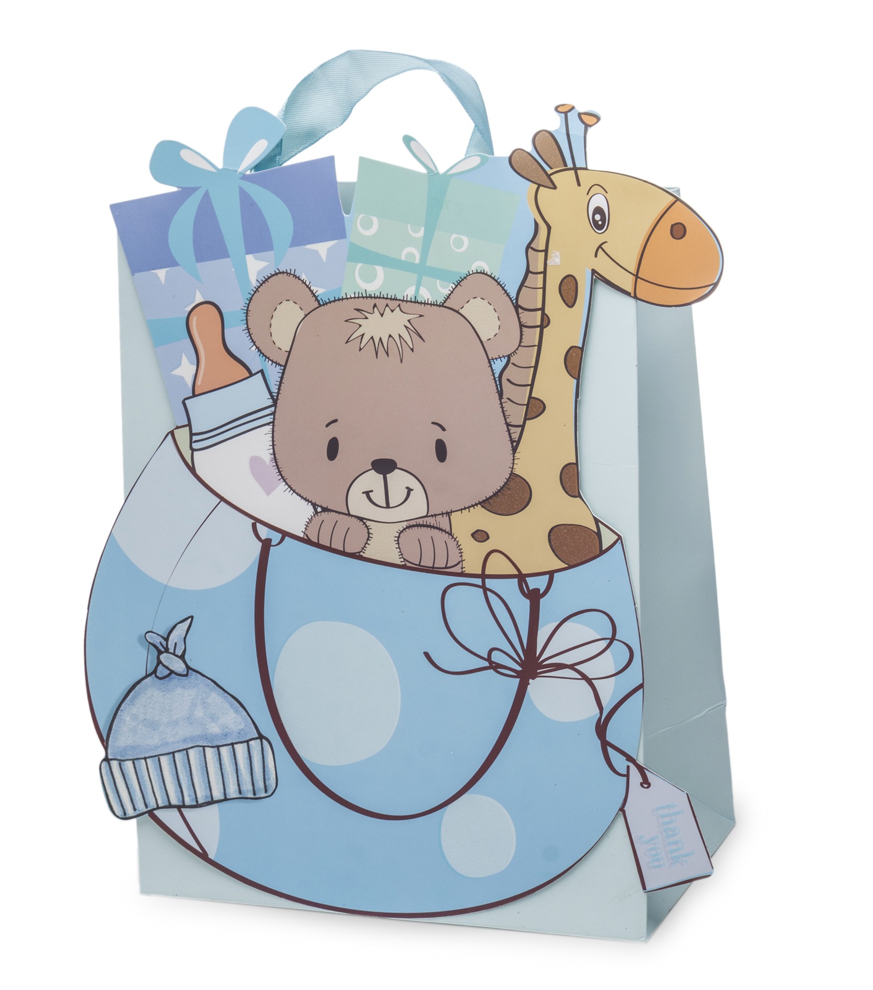 Torebka Papierowa – Prom. BABY BLUE to wyjątkowo uroczne opakowanie prezentowe stworzone z myślą o najmłodszych. Jej front zdobi pastelowa ilustracja z motywem pluszowego misia, żyrafki oraz dziecięcych akcesoriów, utrzymana w delikatnych odcieniach błękitu i mięty. Całość dopełniają subtelne detale oraz dopasowane, błękitne uchwyty z tasiemki, które nadają torbie lekkości i przyjaznego charakteru.