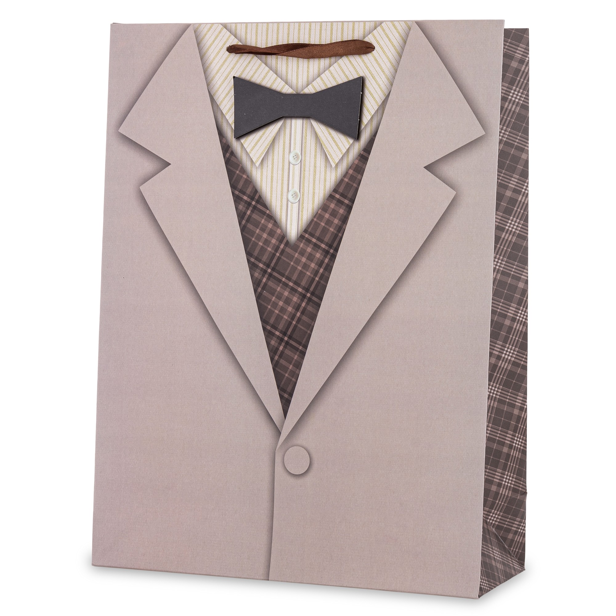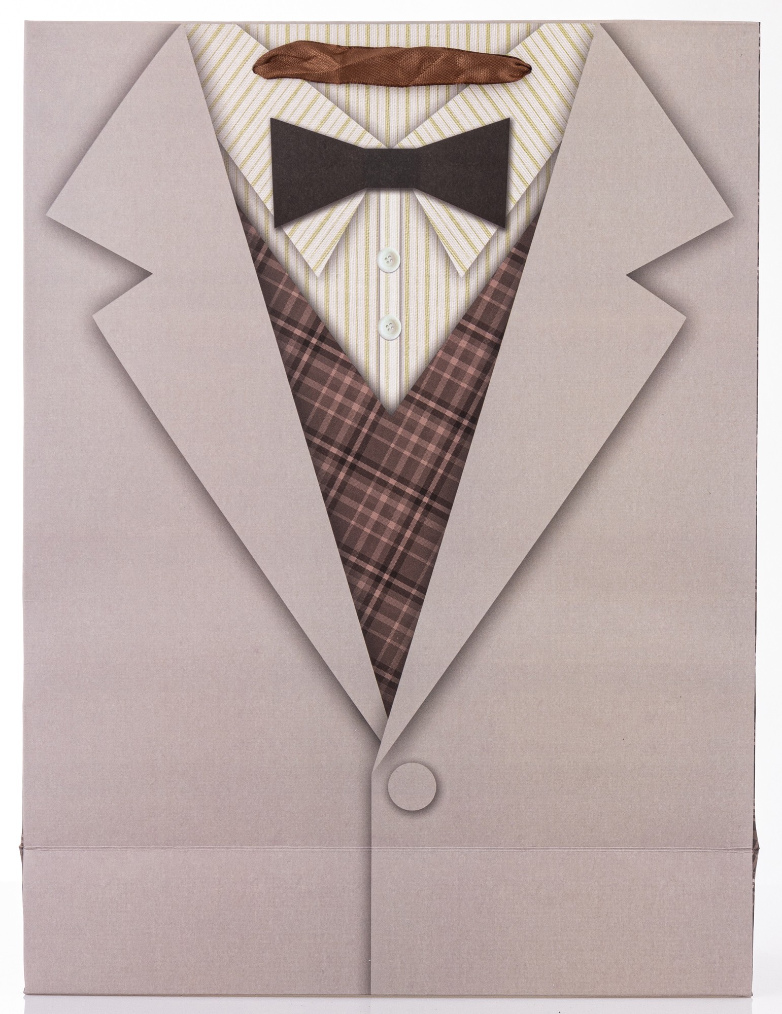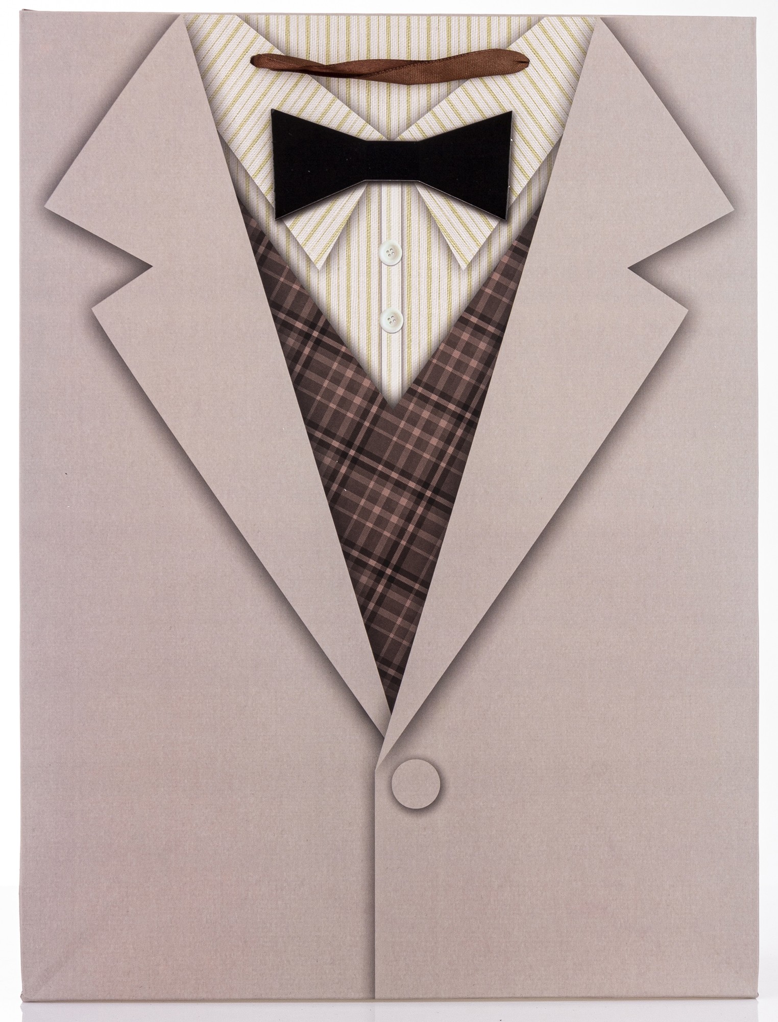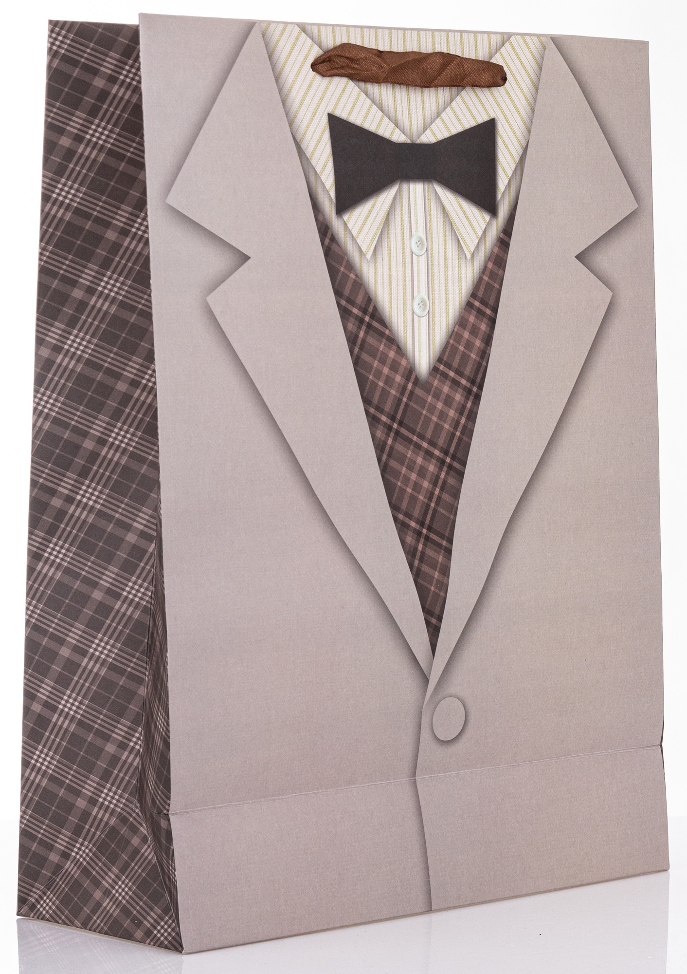 Torebka Papierowa – Prom. BEIGE SUIT to wyjątkowe opakowanie prezentowe, które zachwyca elegancją i dopracowanym, męskim stylem. Jej front zdobi szczegółowa grafika inspirowana klasycznym, jasnym garniturem: beżowa marynarka z jednym guzikiem, wzorzysta kamizelka, koszula w delikatne paski oraz czarna mucha. Boki torby pokryte są dopasowanym, kratkowanym wzorem, który dodaje całości spójności i wyrafinowania.