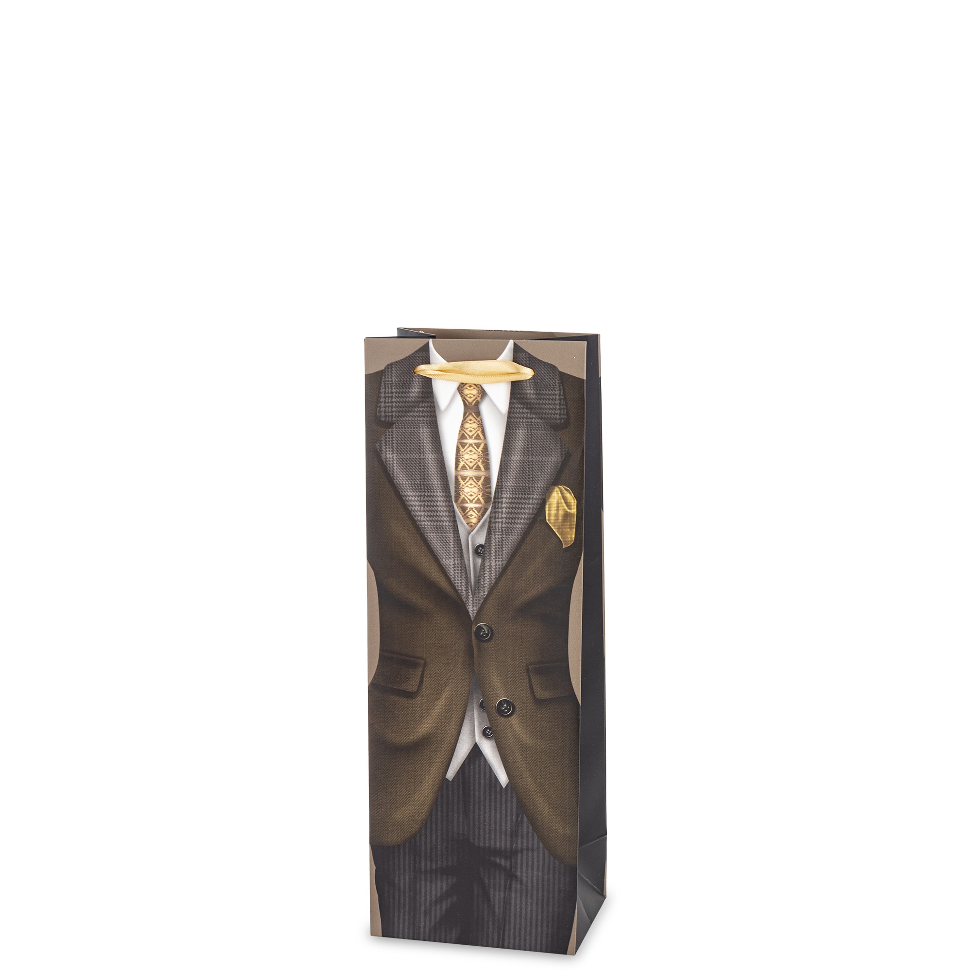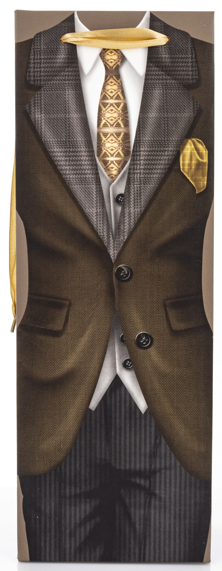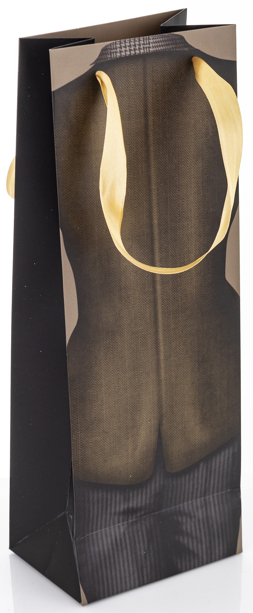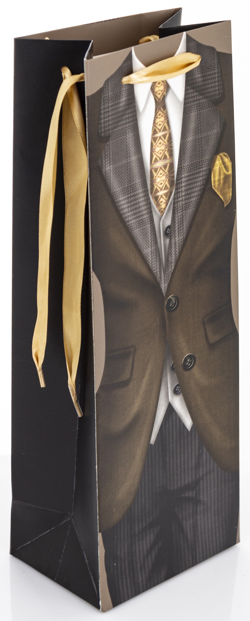 Torebka Papierowa – Prom. ELEGANT SUIT to wyjątkowe opakowanie prezentowe, które wyróżnia się eleganckim, męskim designem. Jej front zdobi szczegółowa grafika stylizowana na klasyczny garnitur: brązowa marynarka, wzorzysta kamizelka, biała koszula, złota krawatka oraz dopasowana poszetka. Całość uzupełniają ciemne spodnie w delikatny prążek, tworząc efekt pełnego, dopracowanego stroju dżentelmena.