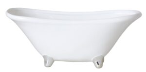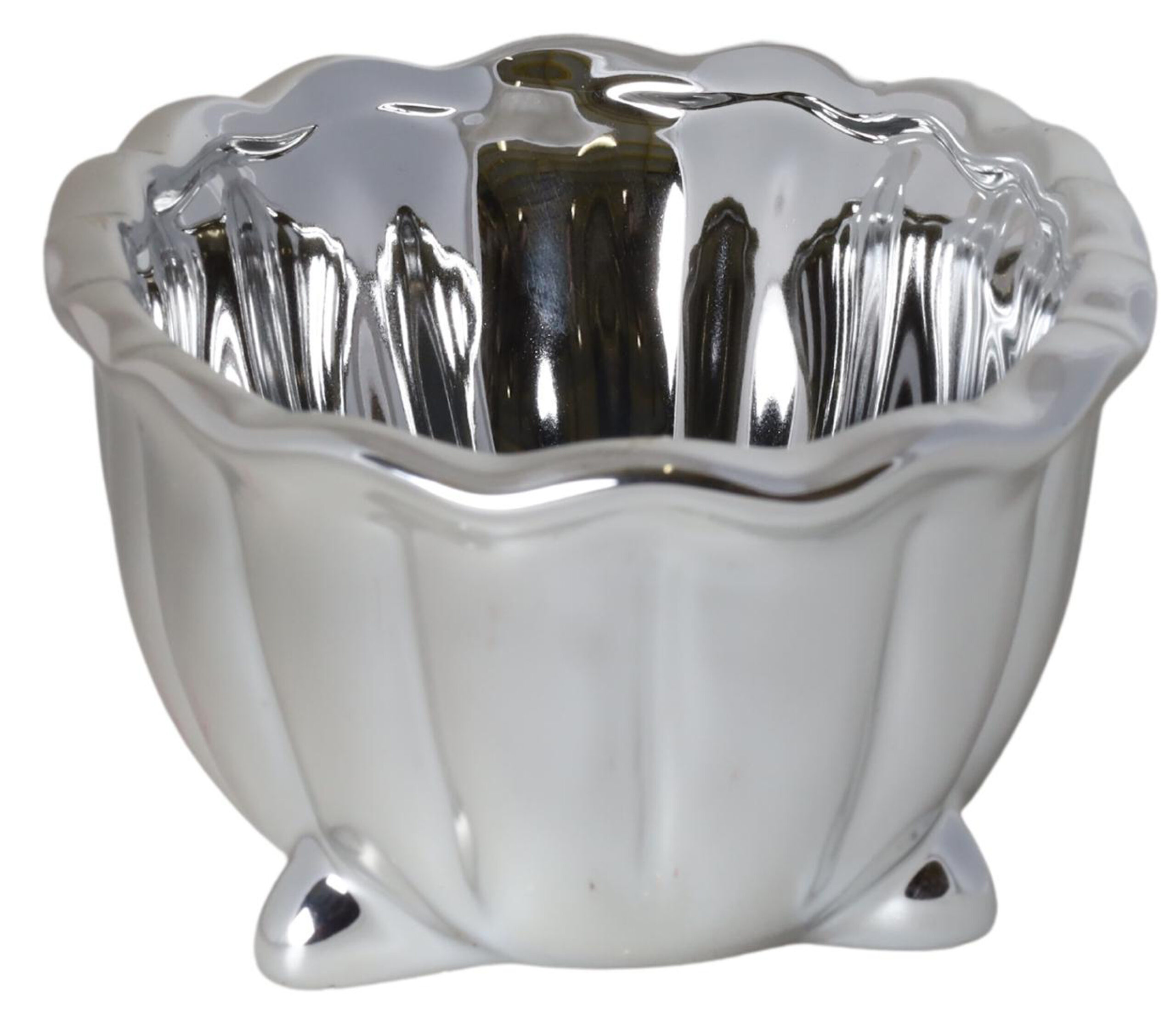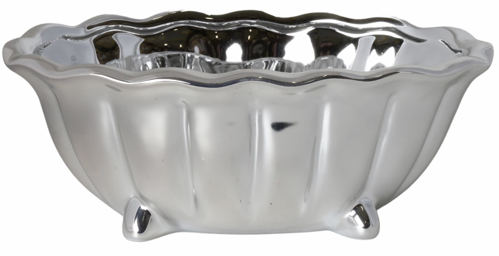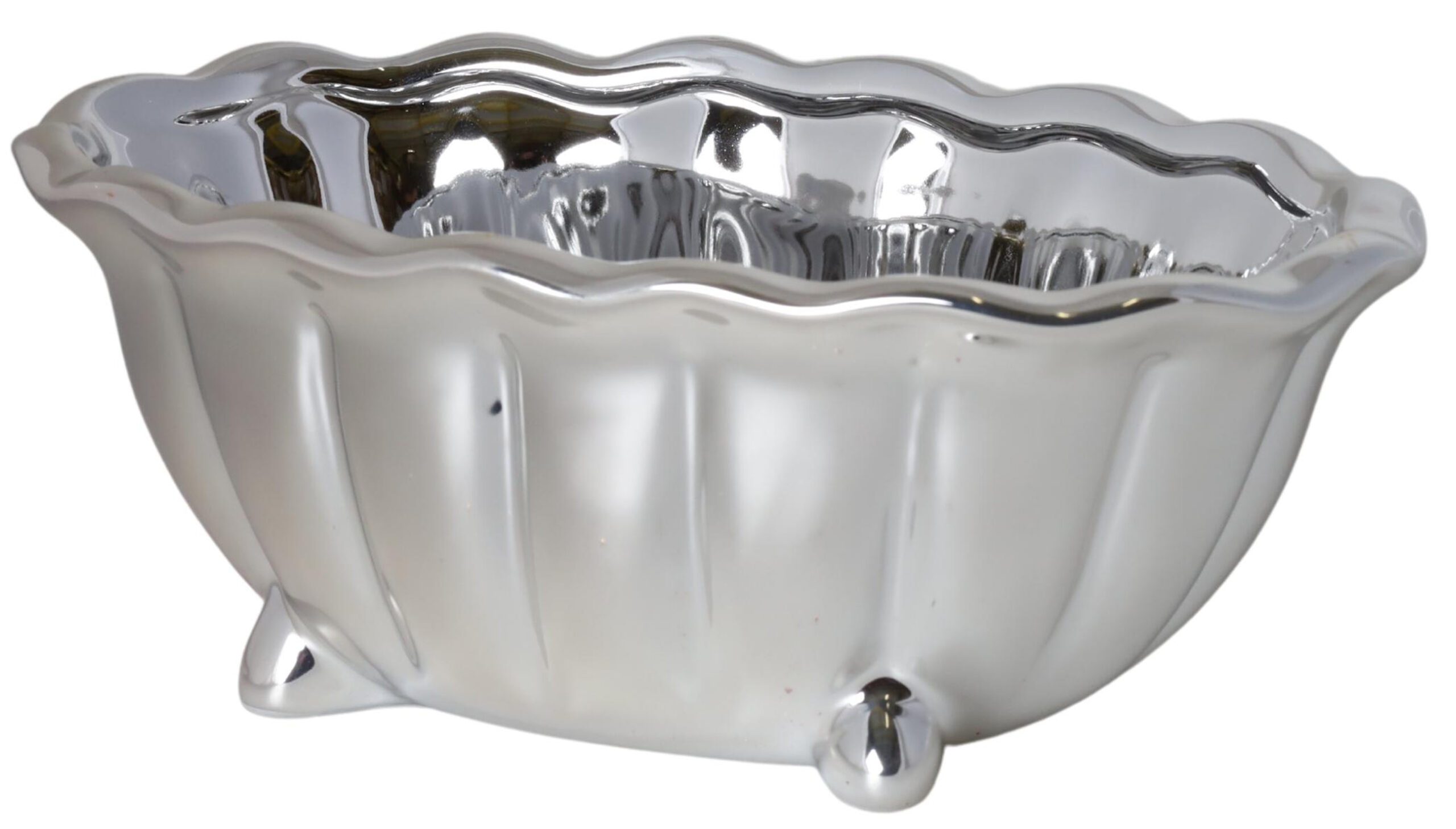 Ta efektowna wanienka to dekoracja, która łączy klasyczną formę z nowoczesnym wykończeniem. Wykonana z ceramiki o lustrzanym, srebrnym połysku, zachwyca elegancją i wyrazistym charakterem. Owalna misa z falowanym rantem, żłobkowanymi bokami i czterema zaokrąglonymi nóżkami nadaje jej styl retro z nutą glamour.