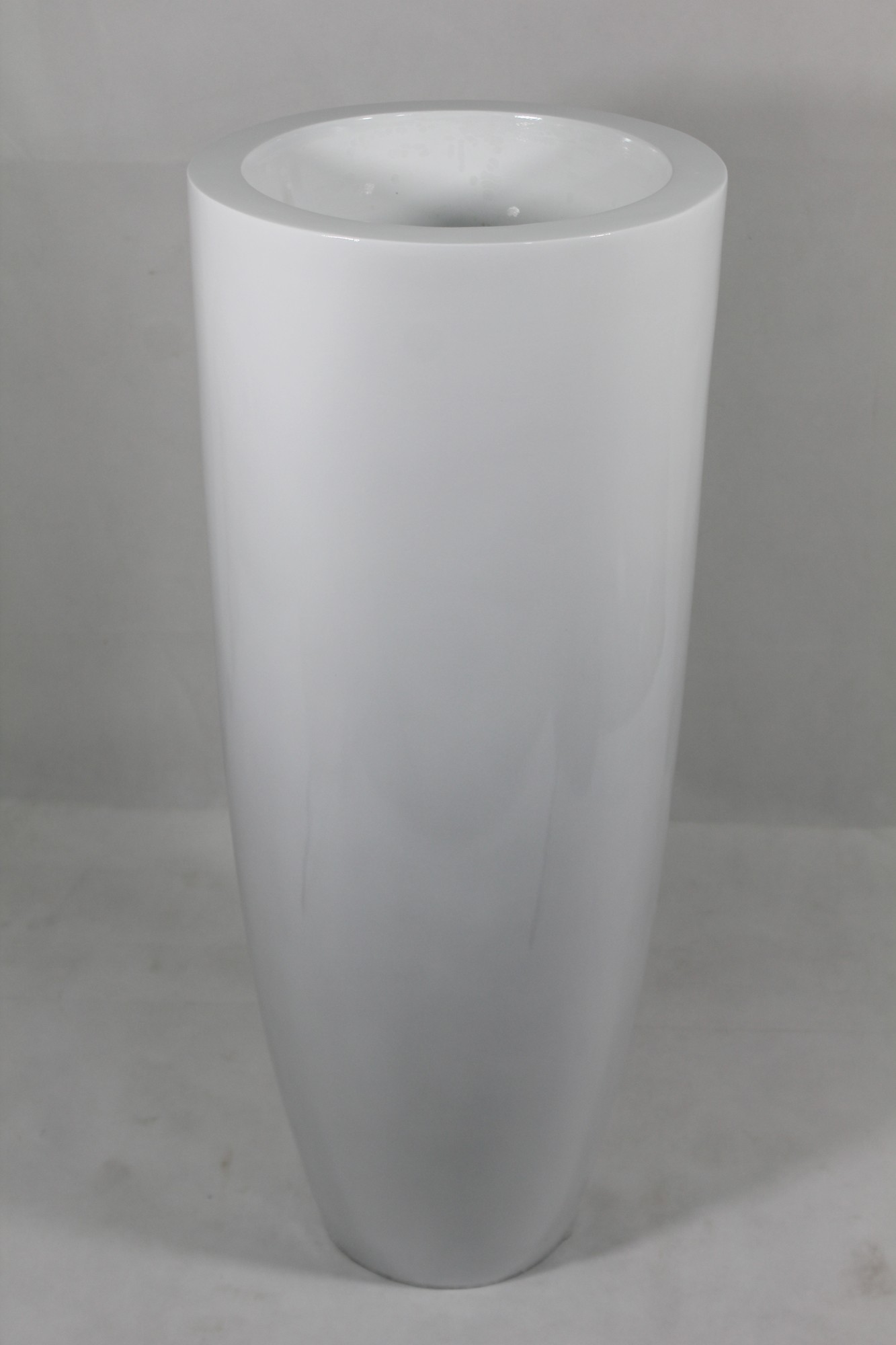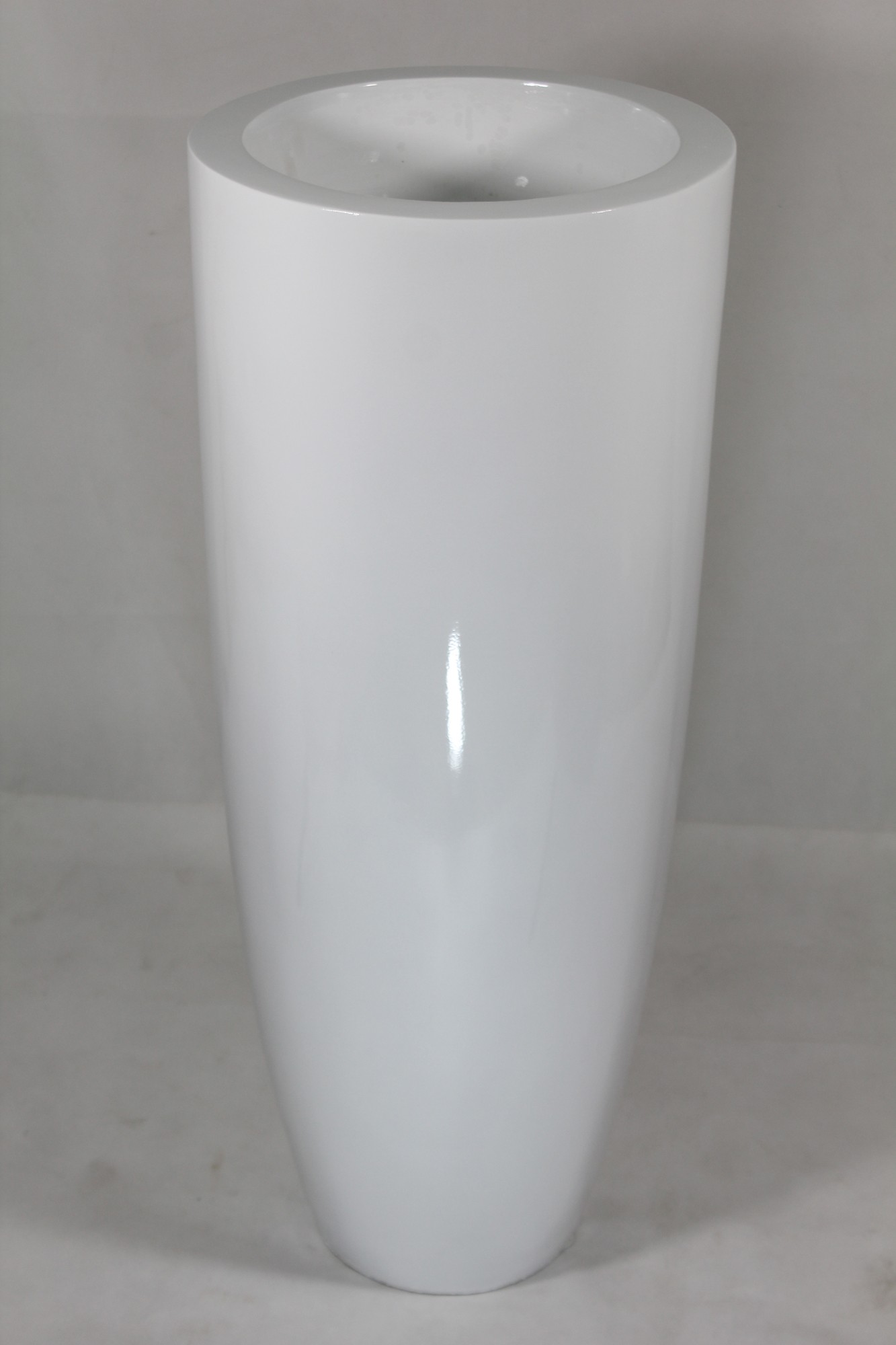Solidny biały wazon ceramiczny o imponujących wymiarach 91 cm wysokości i 36,5 cm średnicy. Jego gładka, biała powierzchnia nadaje mu nowoczesny i minimalistyczny wygląd. Idealny do wnętrz wymagających eleganckich i funkcjonalnych akcentów dekoracyjnych.