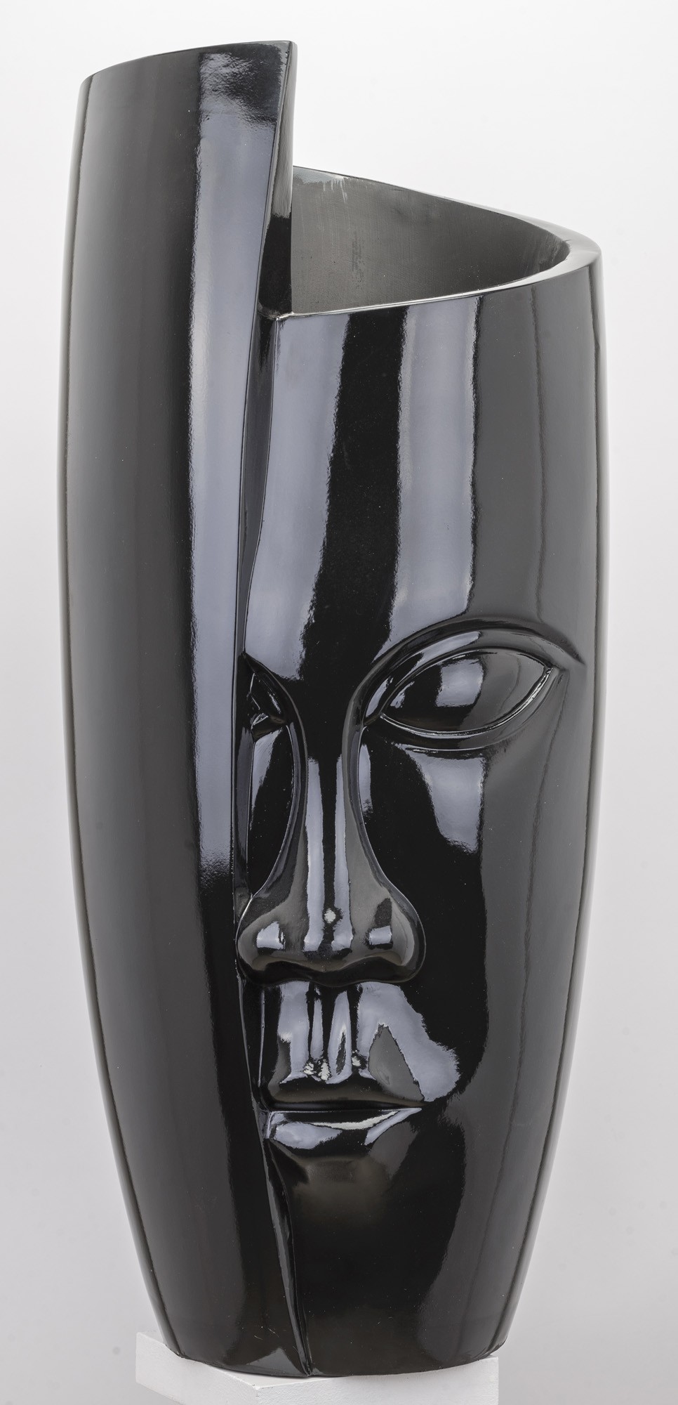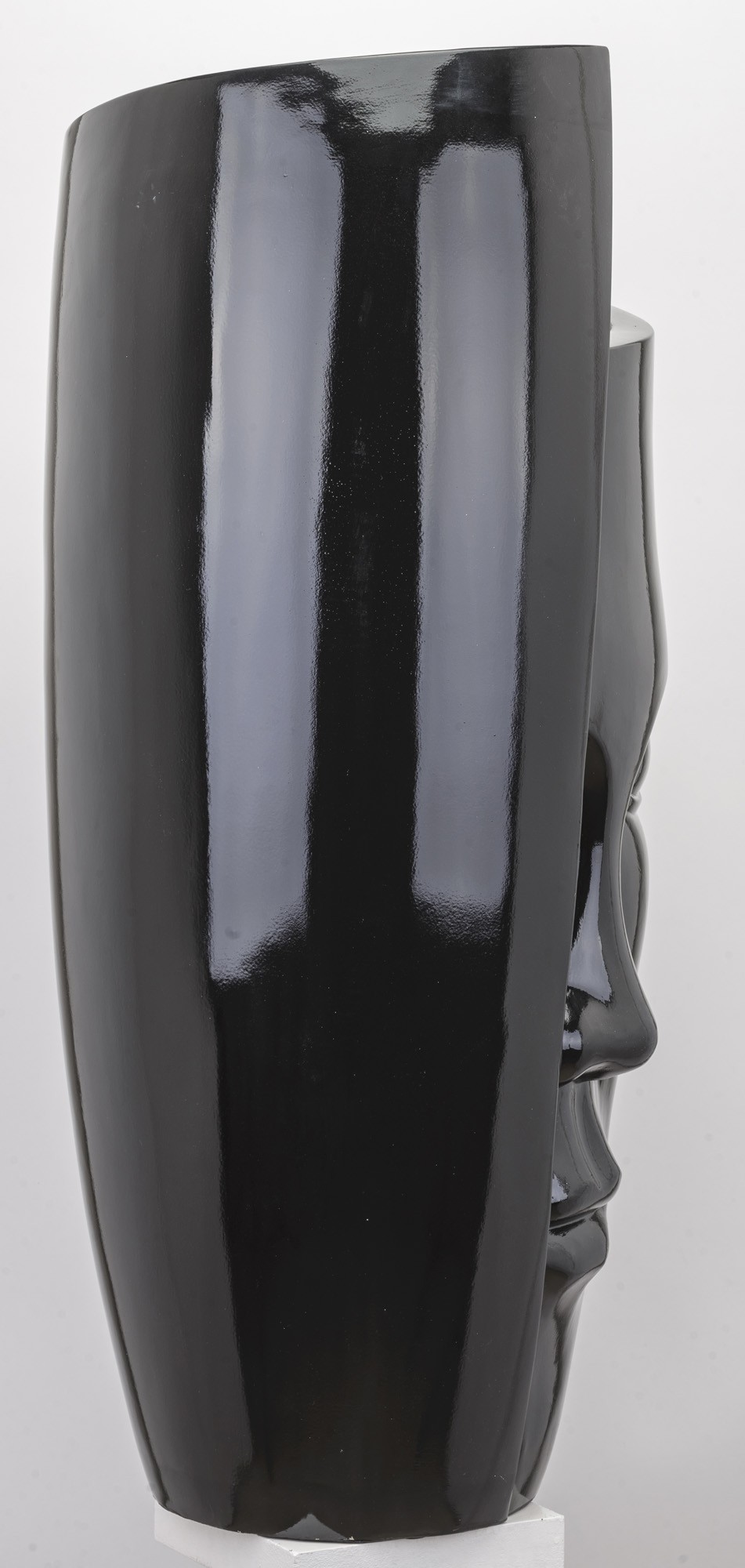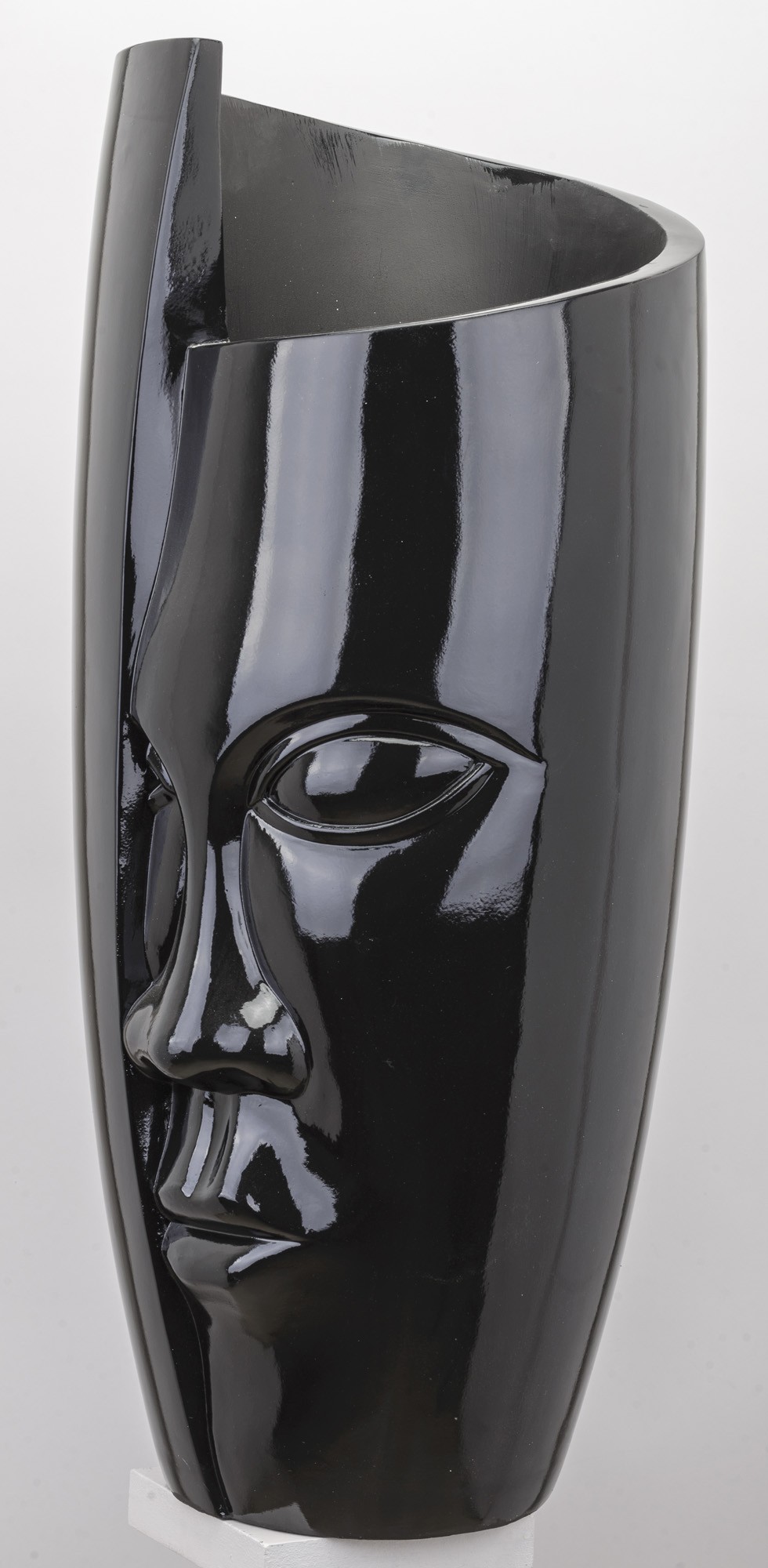 Czarny wazon o nieregularnym kształcie i gładkiej fakturze, kolejny z motywem twarzy wyrzeźbionej w wazonie. Doskonały do eksponowania kwiatów ciętych lub jako samodzielna ozdoba, na pewno doda elegancji każdemu wnętrzu. Wazon ma 90 cm wysokości i 36 cm średnicy.