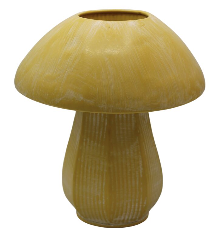 Duży wazon metalowy TROPEN w kształcie grzybka, o żółtym kolorze z efektem postarzenia. Elegancka i oryginalna dekoracja pasująca do każdego wnętrza.