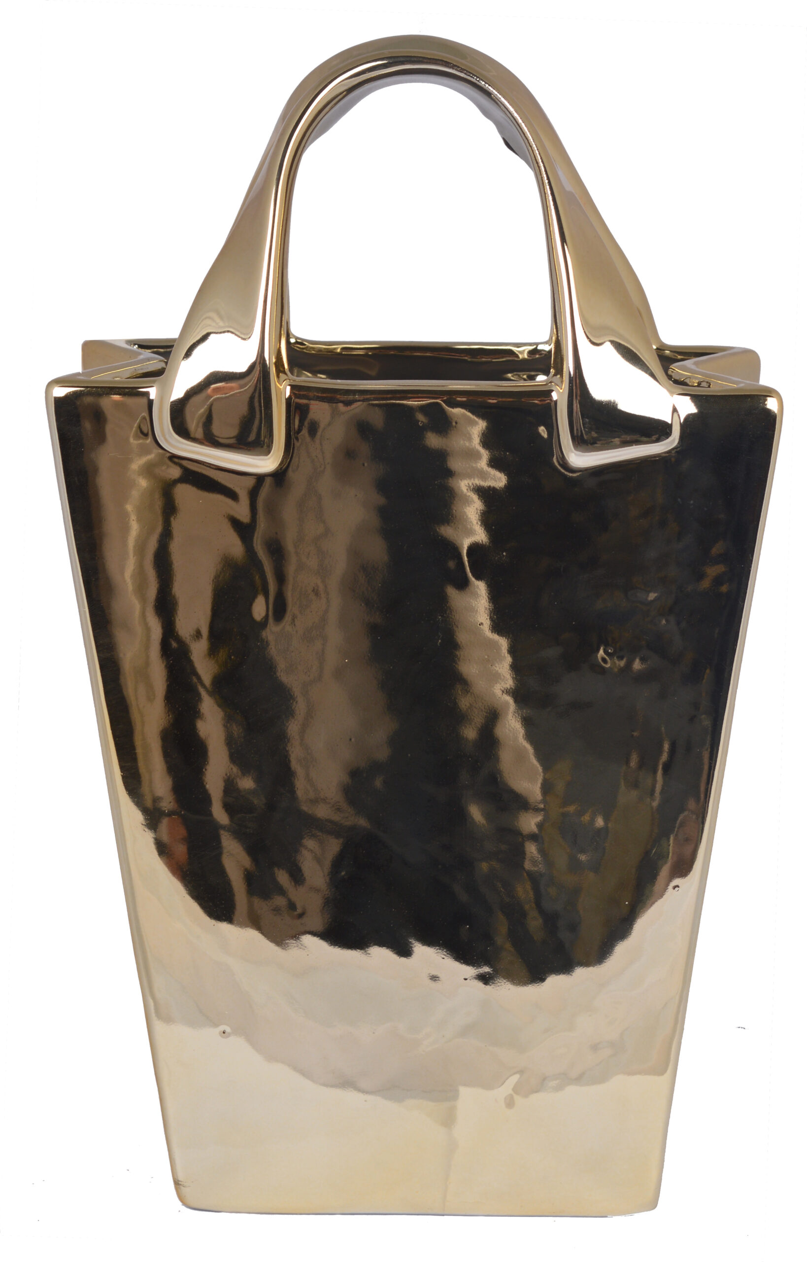 Wykonany z wysokiej jakości ceramiki, wazon jest trwały, solidny i przyjemny w dotyku. Jego precyzyjne wykonanie sprawia, że można cieszyć się nim przez długie lata, dodając wnętrzu subtelnej elegancji. Wazon torebka ceramiczna złota to doskonały wybór dla tych, którzy cenią innowacyjny styl, minimalistyczną estetykę i wysoką jakość wykonania. Jego obecność w pomieszczeniu podkreśli indywidualność aranżacji, tworząc atmosferę pełną nowoczesnego piękna.
