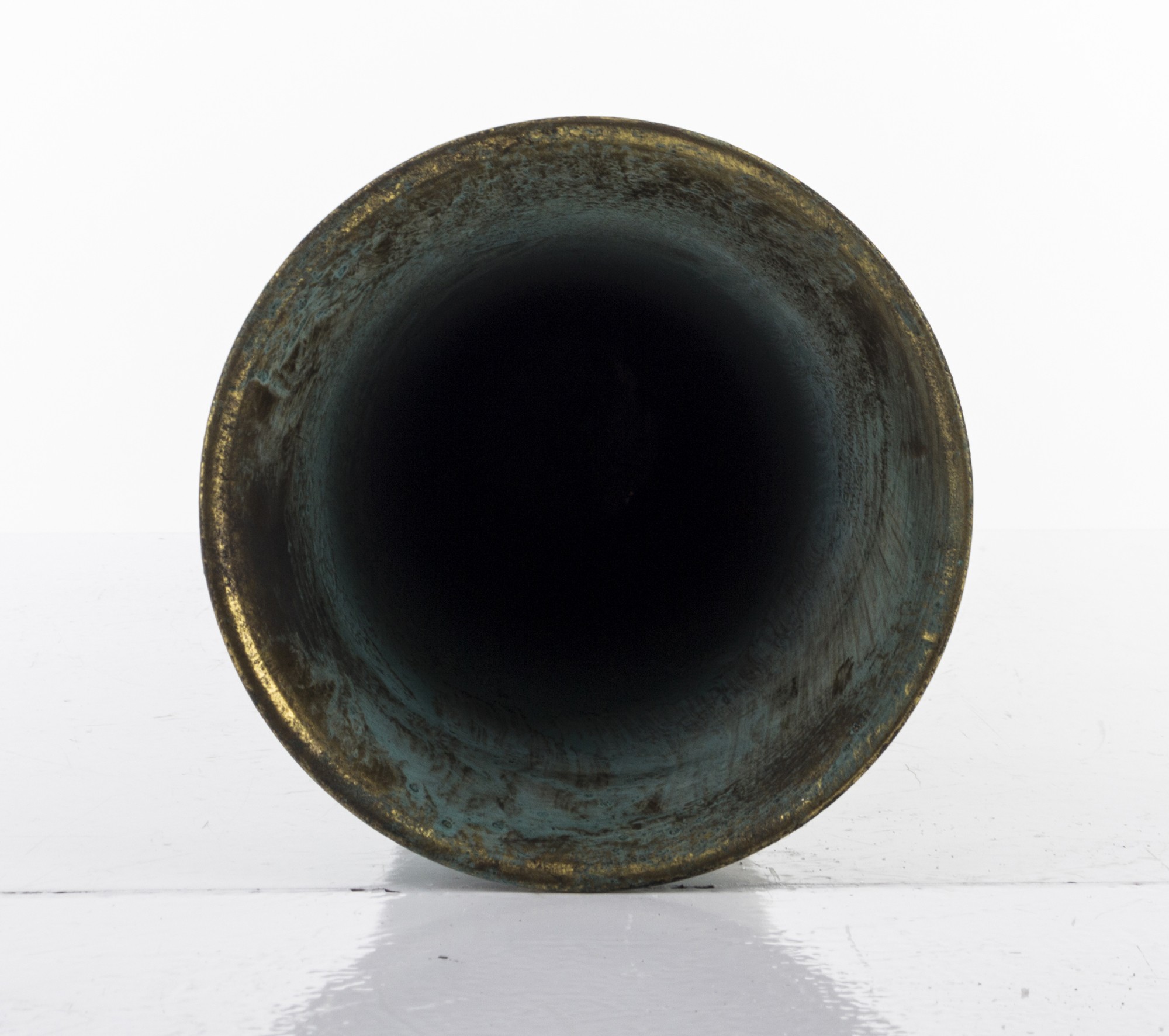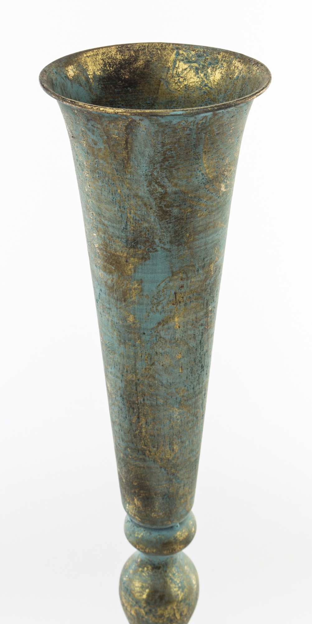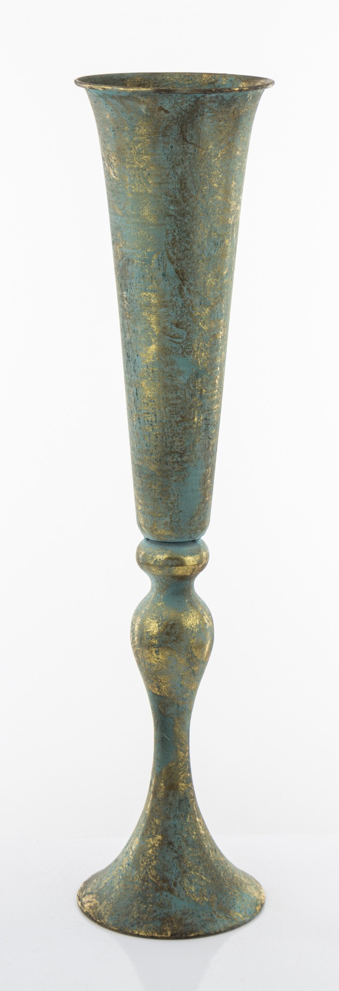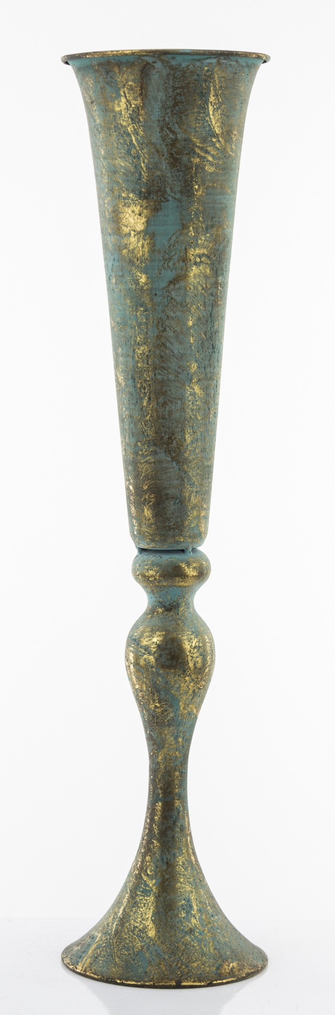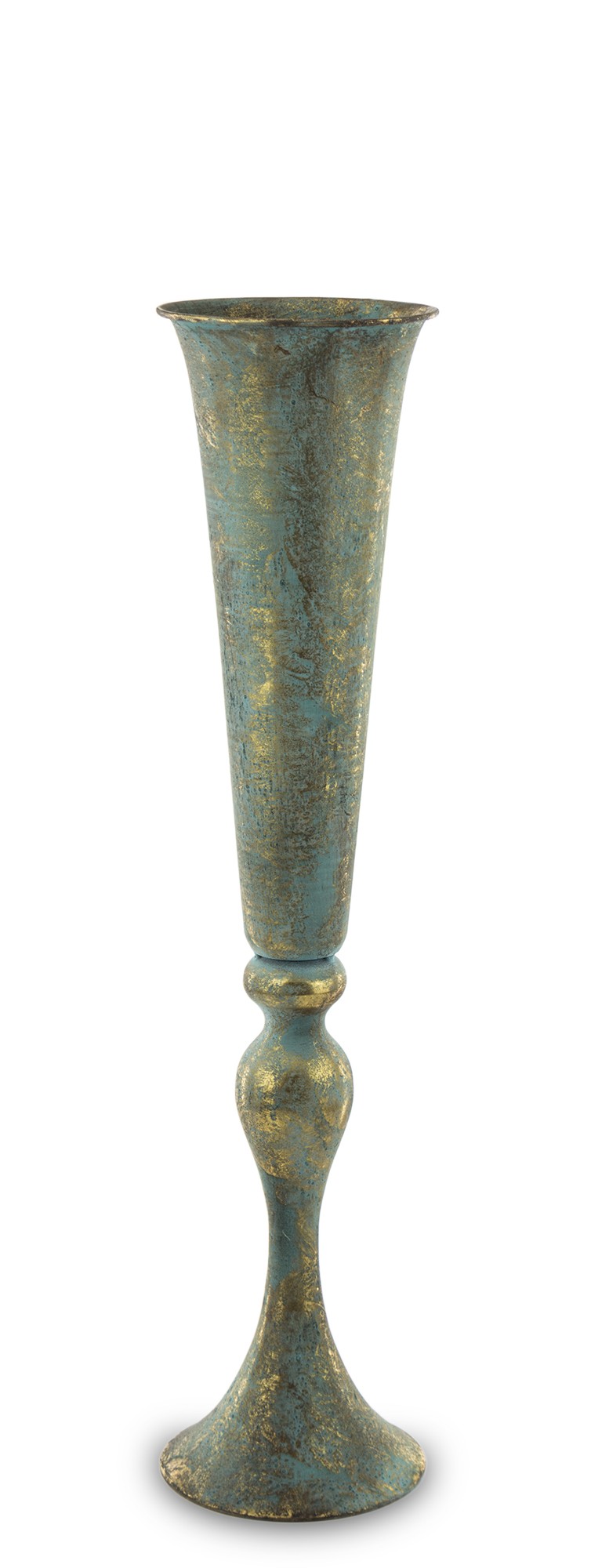 Stylowy wazon ZEUS w antycznym stylu, łączący odcienie patynowanego turkusu i złota. Elegancka, smukła forma z dekoracyjną podstawą dodaje mu wyjątkowego charakteru.