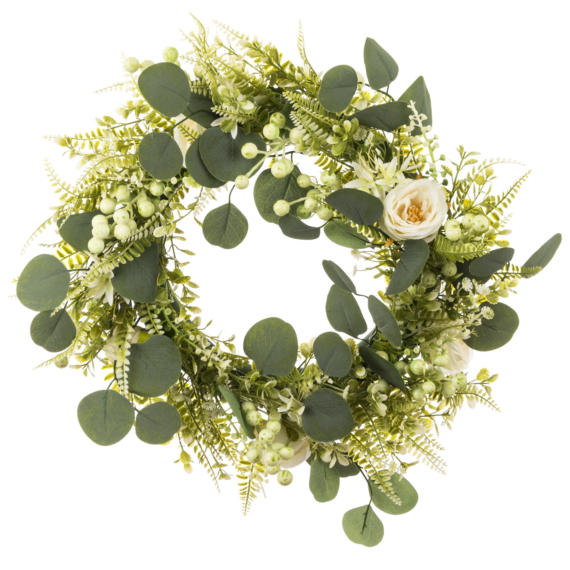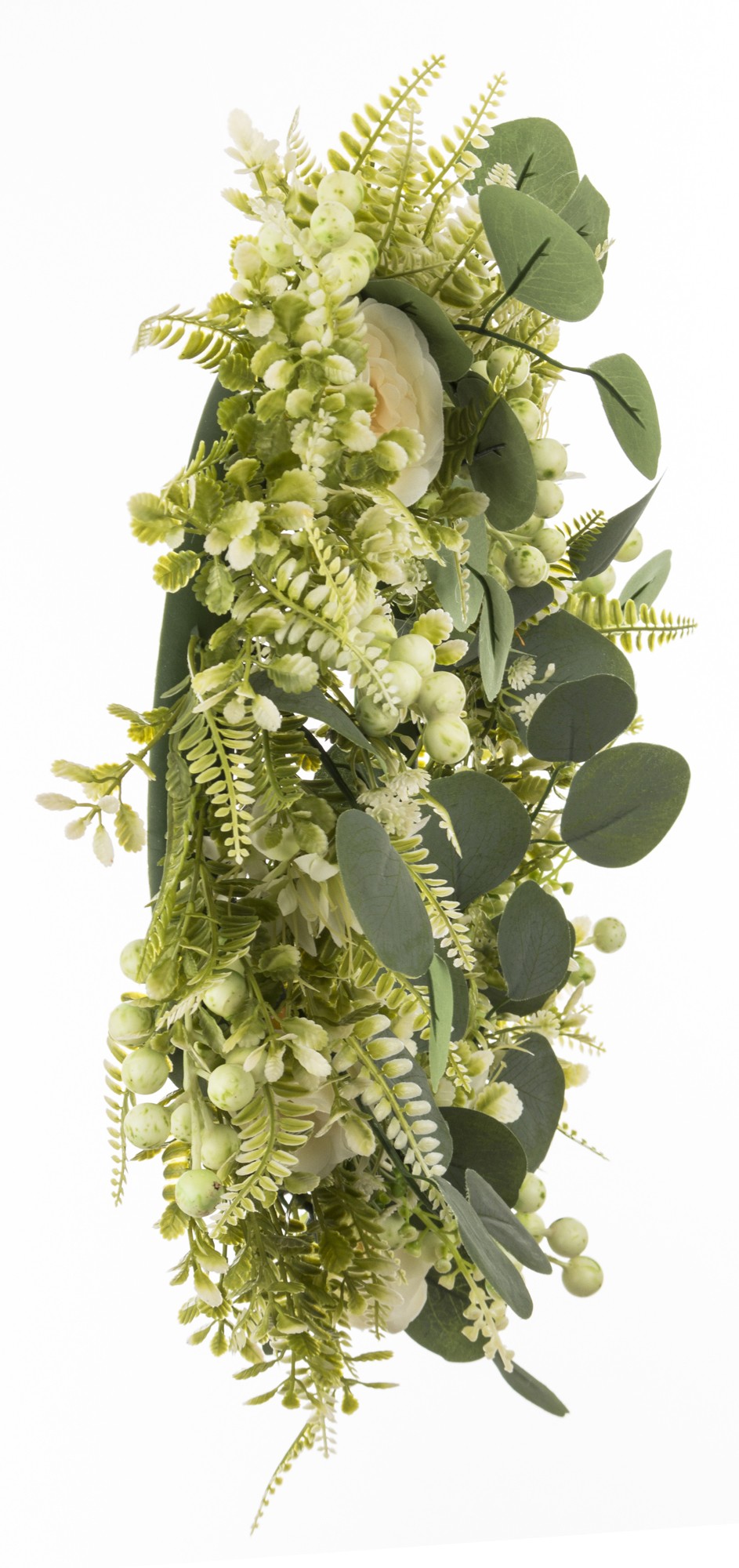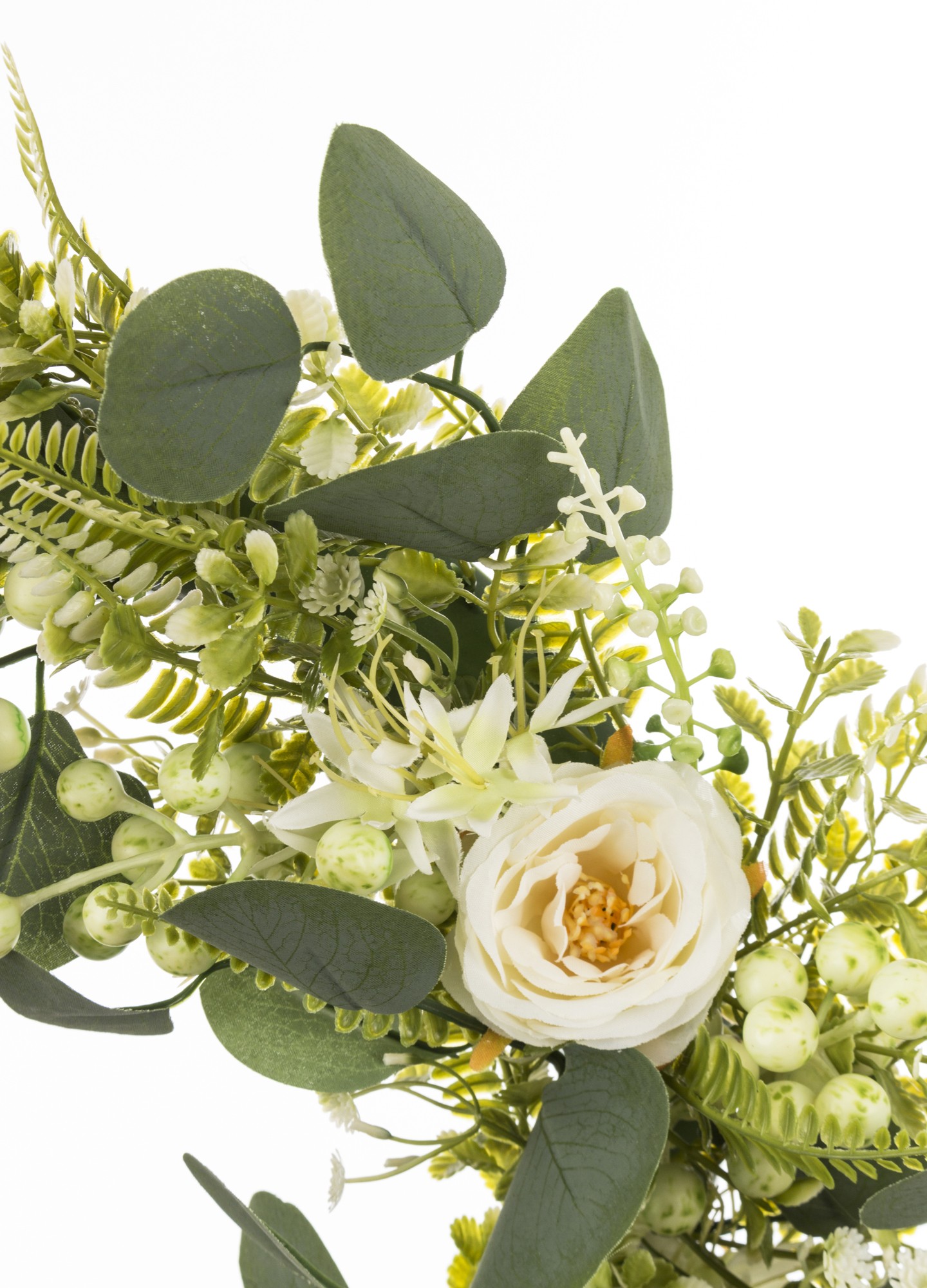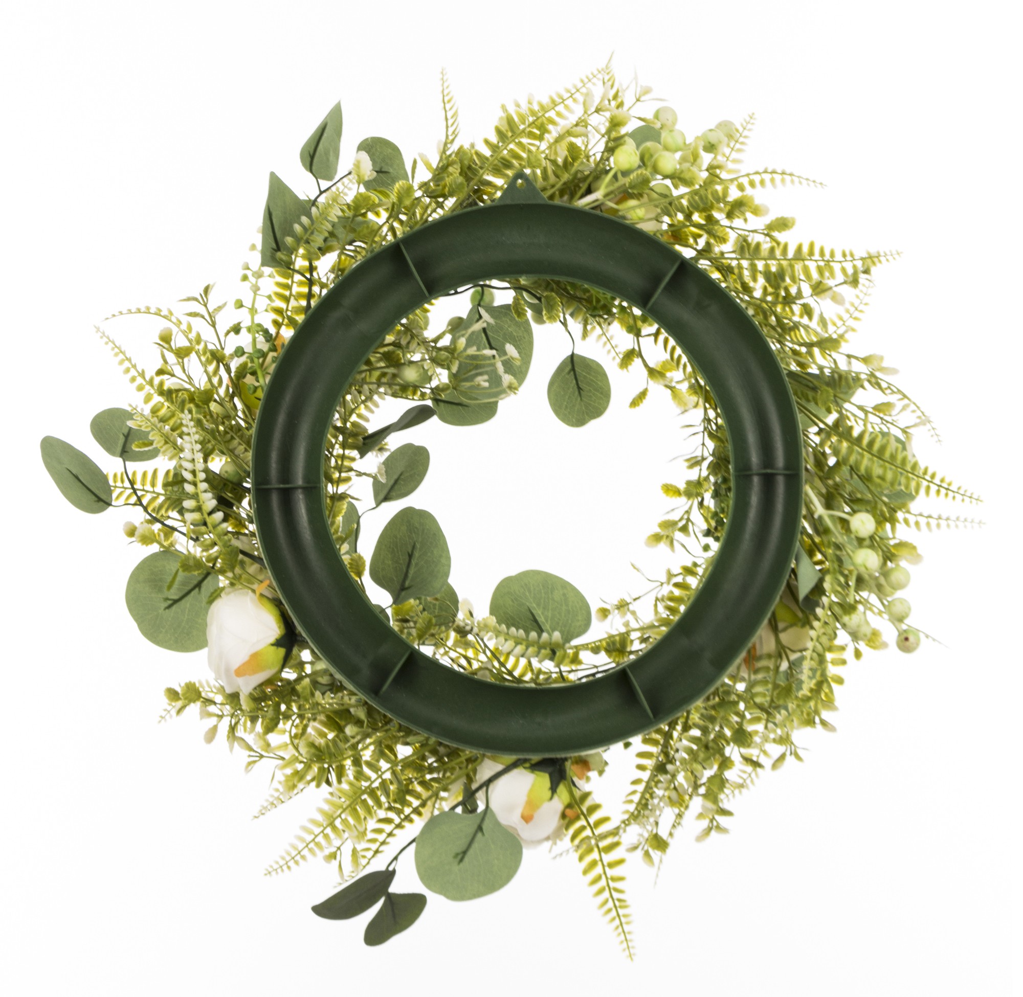 GREEN BLOOM to wianek, który łączy świeżość zielonych liści z delikatnością białych kwiatów i drobnych dekoracyjnych akcentów. Kompozycja została ułożona tak, aby wyglądała jak naturalnie spleciona — z różnorodnych odcieni zieleni, eukaliptusowych gałązek i subtelnych białych elementów, które dodają całości lekkości i elegancji.