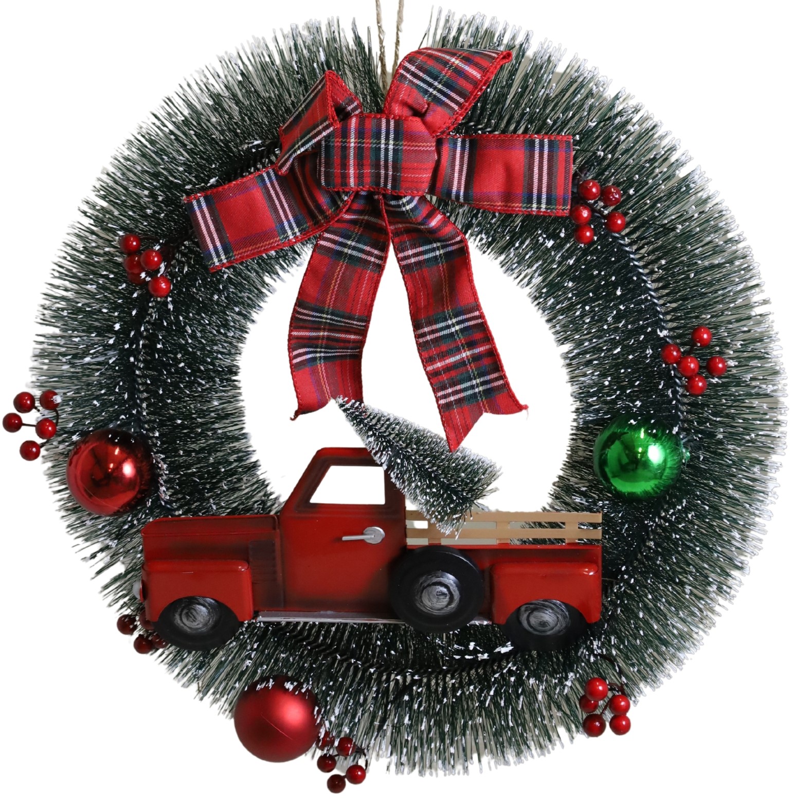 Wieniec OLCI to klasyczna świąteczna dekoracja w zieleni z dużą, czerwoną kokardą i uroczym motywem świątecznego pickupa. Idealny na drzwi, wprowadzi do domu radosny, bożonarodzeniowy nastrój.