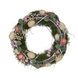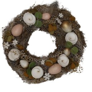 Ten piękny wieniec dekoracyjny WEJCE został starannie wykonany z naturalnych materiałów, takich jak mech i gałązki, tworząc rustykalny i naturalny wygląd. Wieniec jest ozdobiony delikatnymi różowymi kwiatami, które dodają mu subtelnego uroku. Dodatkowo, wieniec zawiera sztuczne jajka w różnych odcieniach beżu i złota, co nadaje mu elegancki i świąteczny charakter. Zielone liście i drobne gałązki dodają całości świeżości i naturalności. Ten wieniec jest idealny do dekoracji domu na wiosnę lub jako ozdoba wielkanocna, wprowadzając do wnętrza ciepłą i przytulną atmosferę.