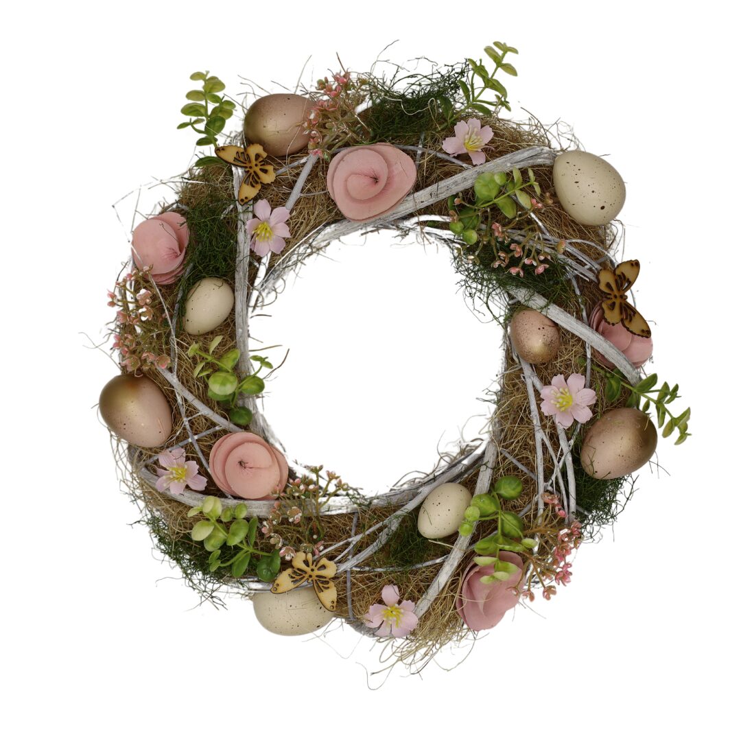 Wieniec dekoracyjny WEJCE wykonany z naturalnych materiałów, ozdobiony różowymi kwiatami, sztucznymi jajkami i zielonymi liśćmi. Idealny na wiosenne dekoracje lub jako ozdoba wielkanocna.