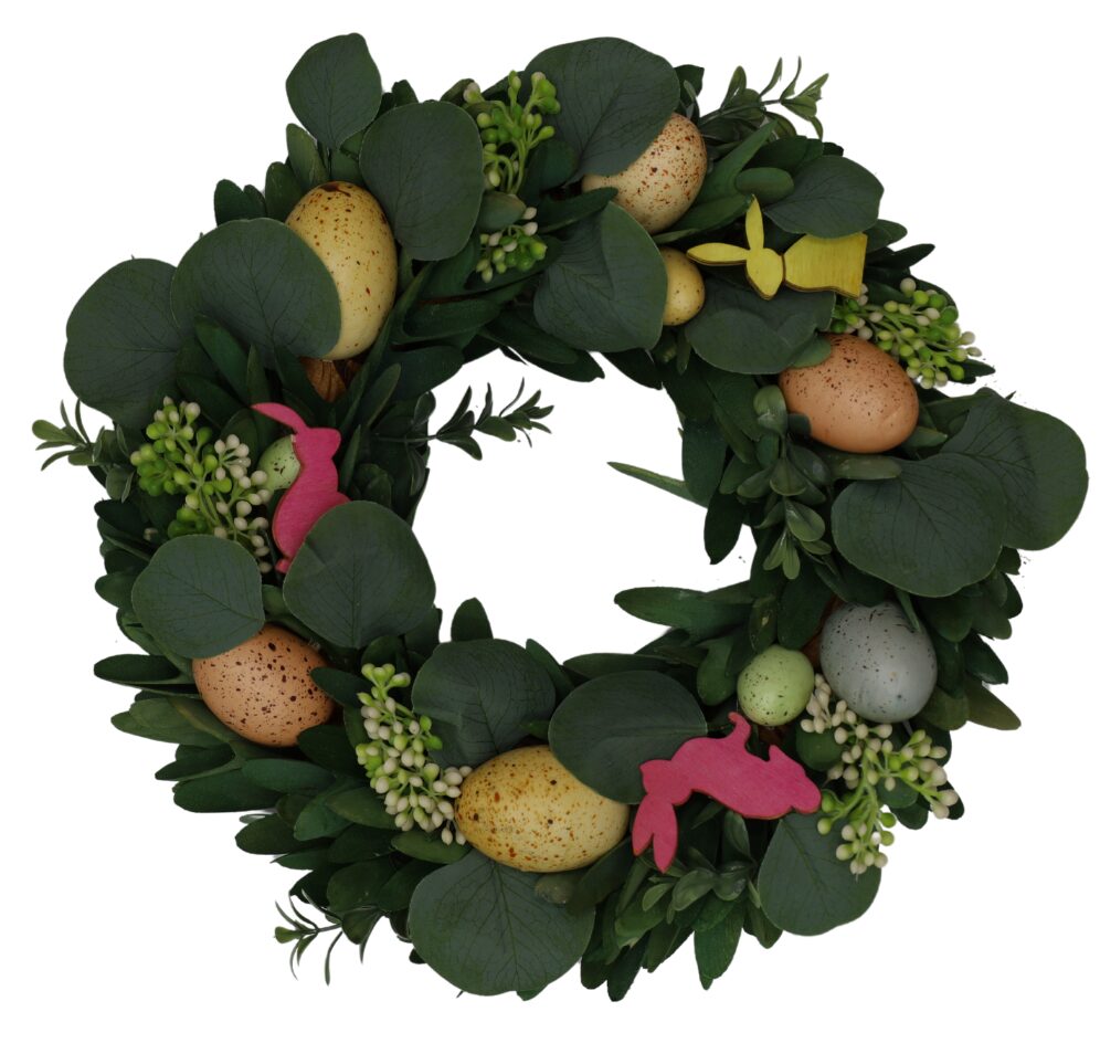 Wieniec dekoracyjny OVO z zielonych liści, ozdobiony kolorowymi jajkami i figurkami królików, idealny na Wielkanoc.