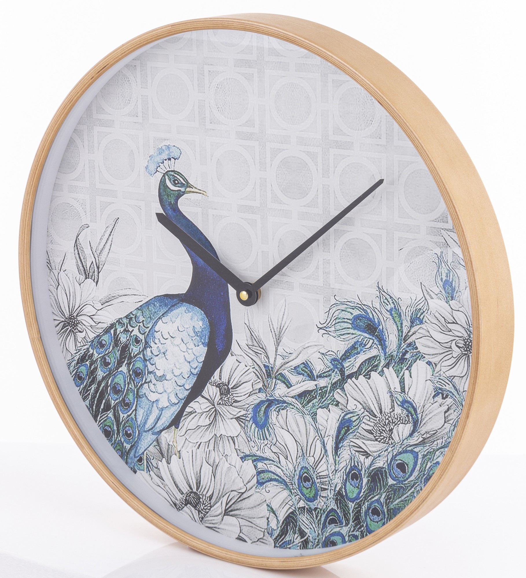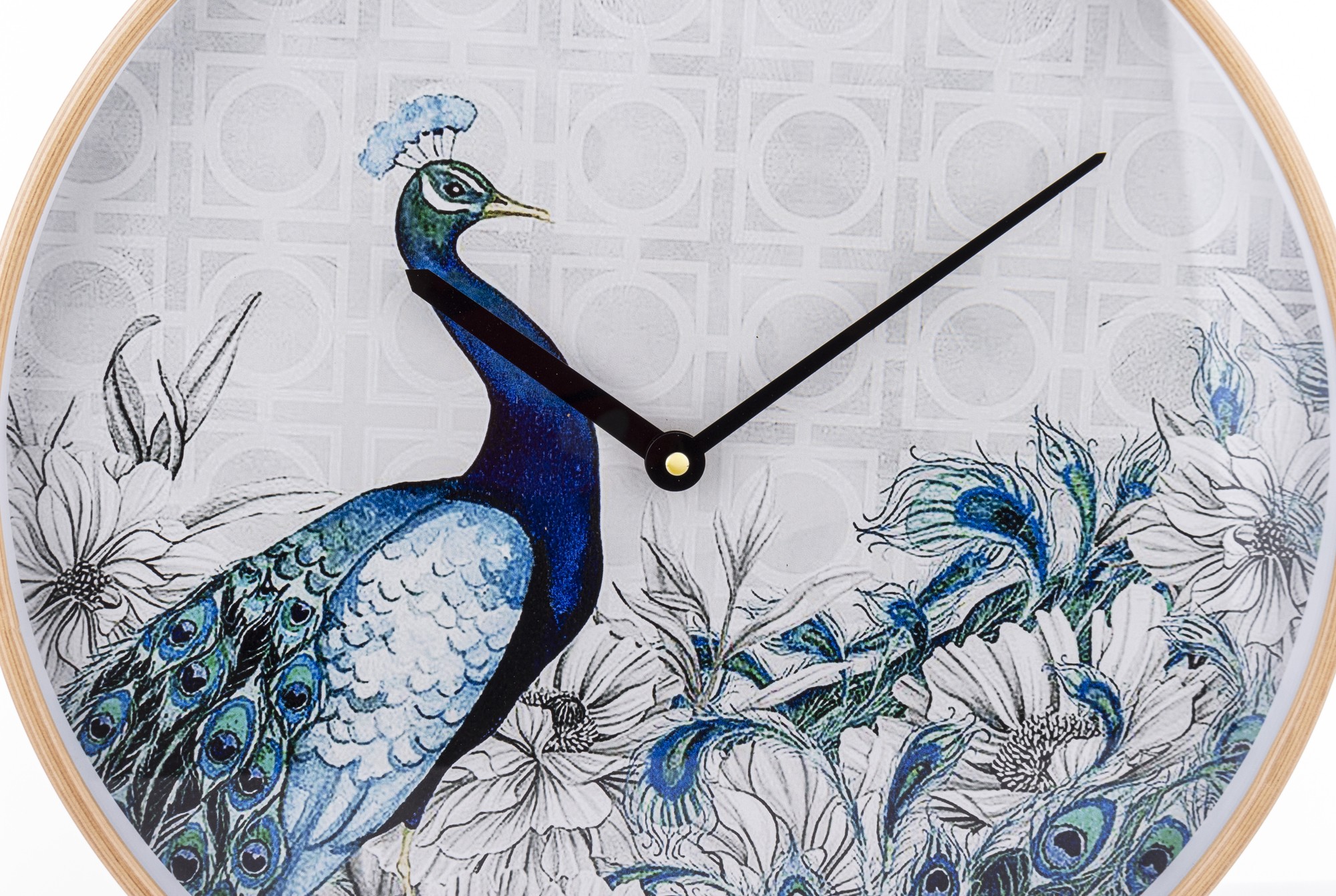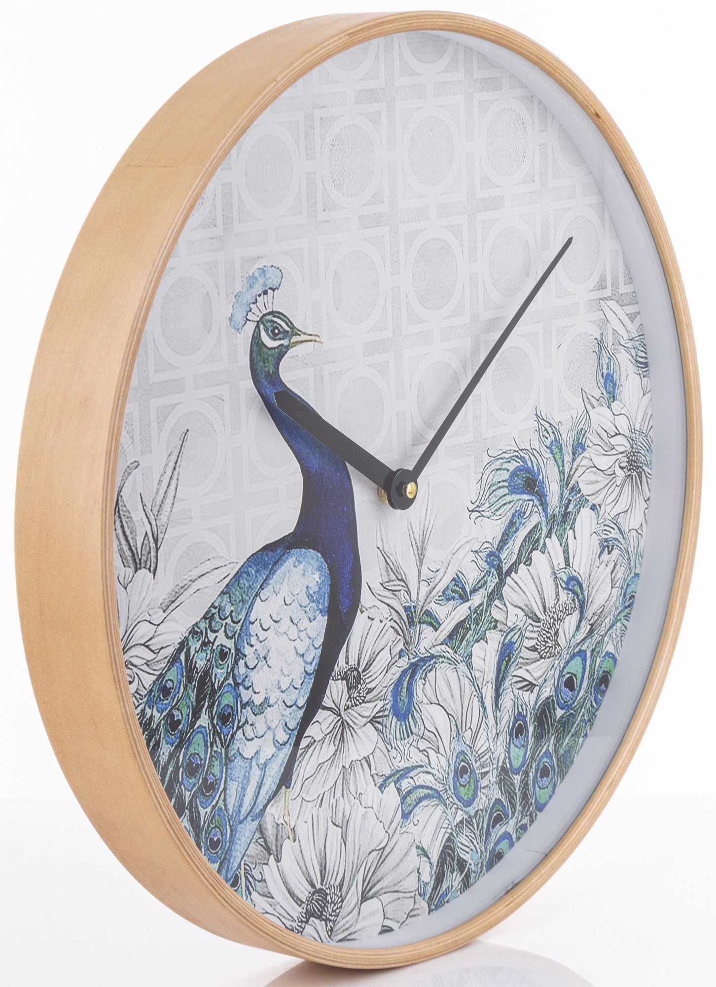 Okrągły zegar z drewnianą ramką i cyferblatem zabezpieczonym szkłem. Tarcza zegara przedstawia niebieskiego pawia wśród traw i kwatów, utrzymana w delikatnej niebiesko-białej kolorystyce. Czarne wskazówki zapewniają funkcjonalność, a brak cyfr sprawia, że zegar wygląda jak piękny obraz.