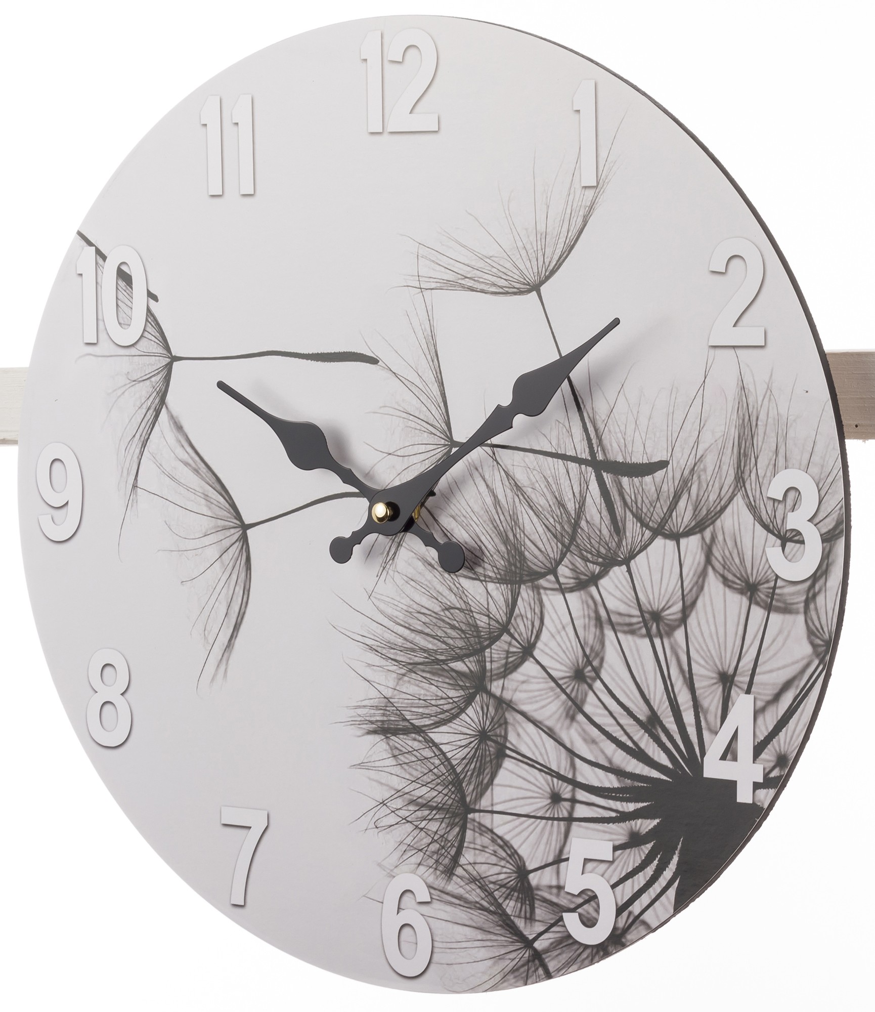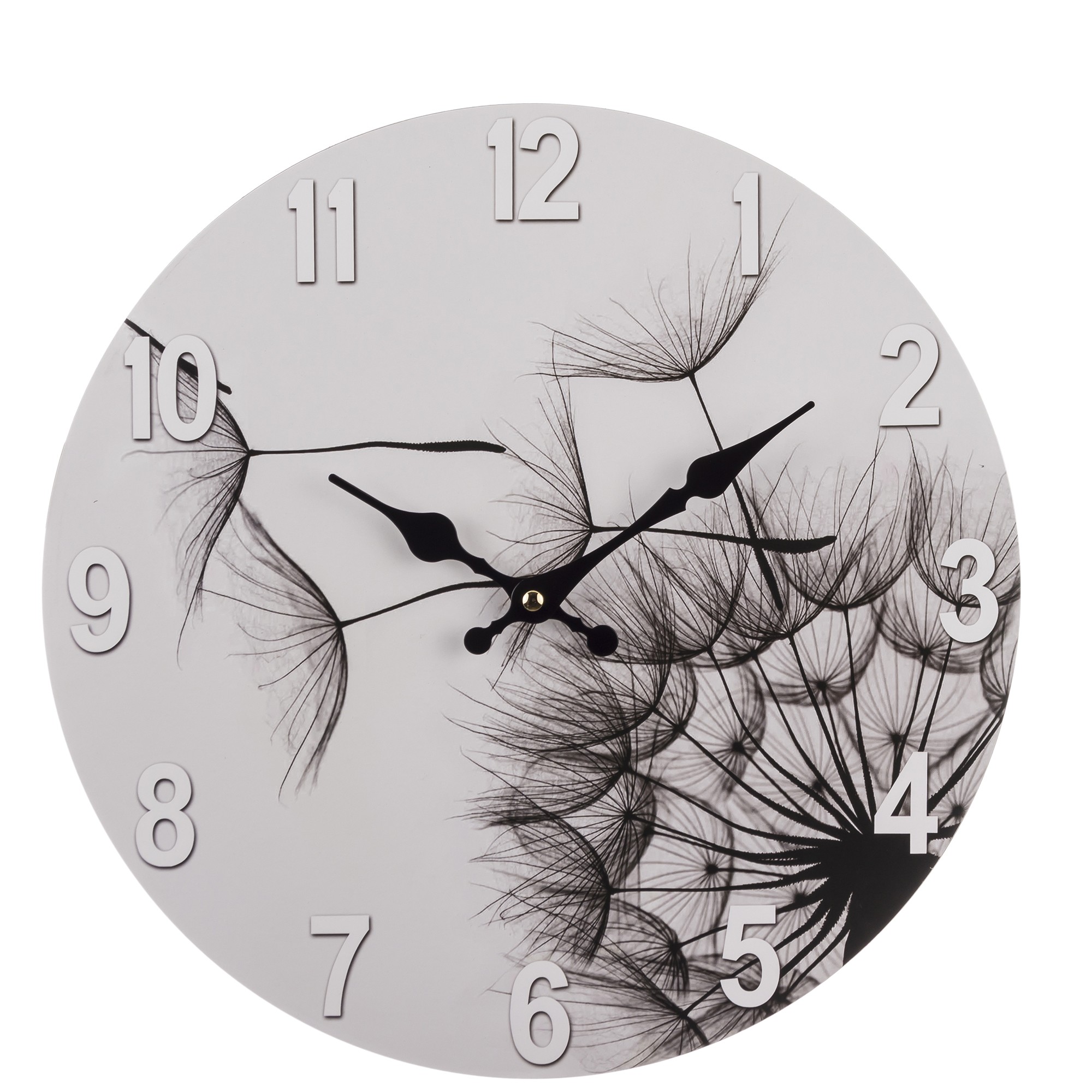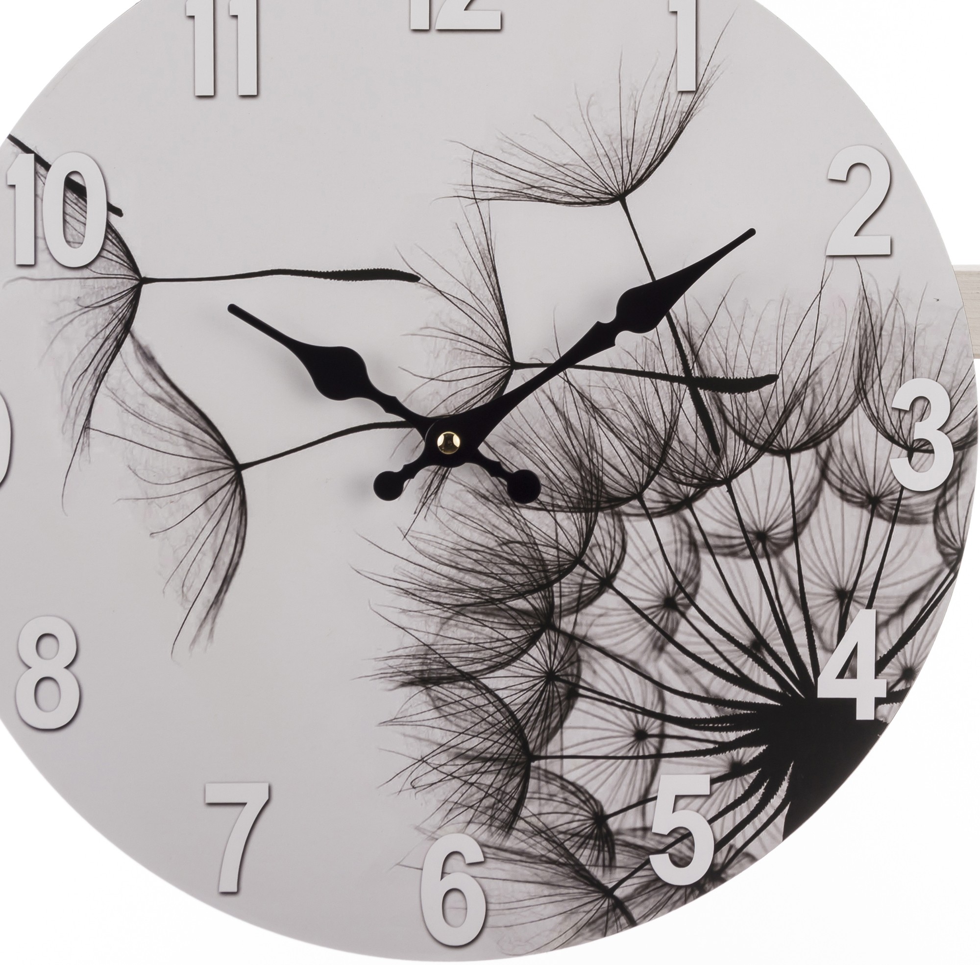 Okrągły zegar z płyty MDF posiada tarczę w odcieniu bieli, ozdobioną czarnym rysunkiem dmuchawca. Wyraziste białe cyfry oznaczające godziny oraz czarne wskazówki zapewniają łatwość odczytu czasu. Ten elegancki zegar jest stylowym dodatkiem do każdego wnętrza, łącząc subtelność natury z funkcjonalnością.