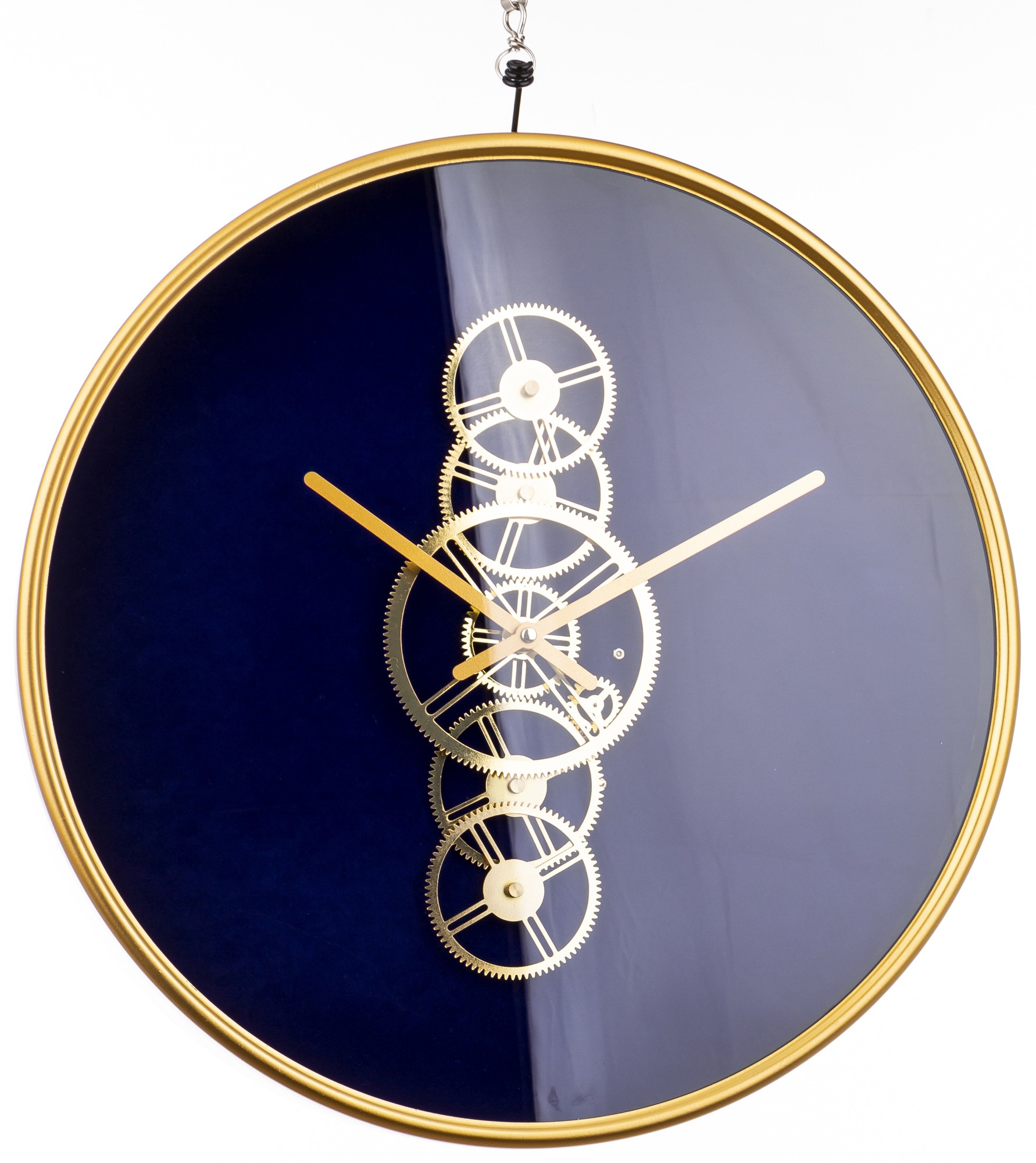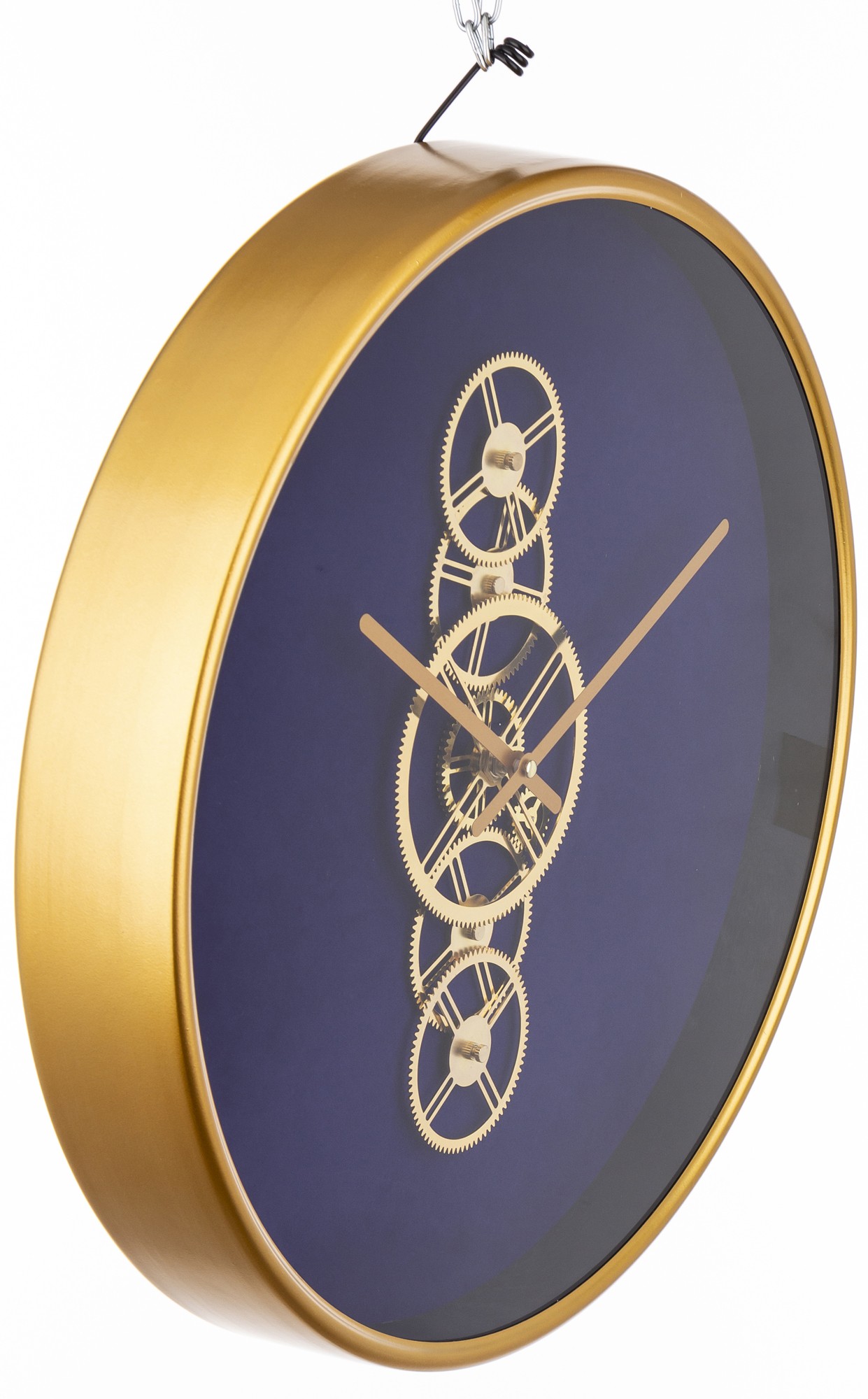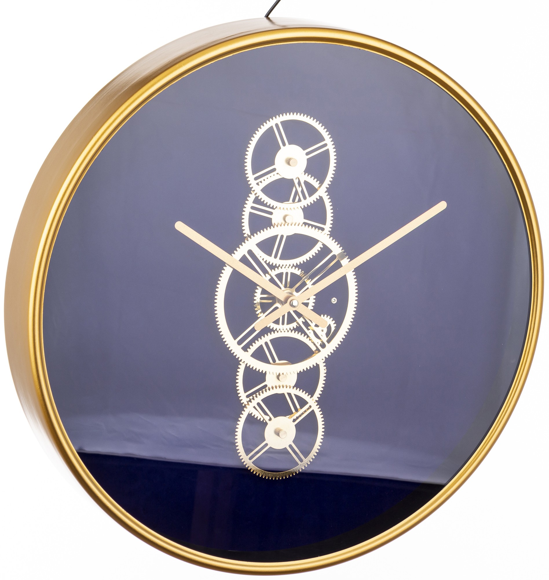Tarcza zegara zawiera wyraźny mechanizm, co nadaje mu industrialnego charakteru. Piękne złote wskazówki doskonale kontrastują z głębokim granatem, nadając zegarowi ekskluzywny wygląd.