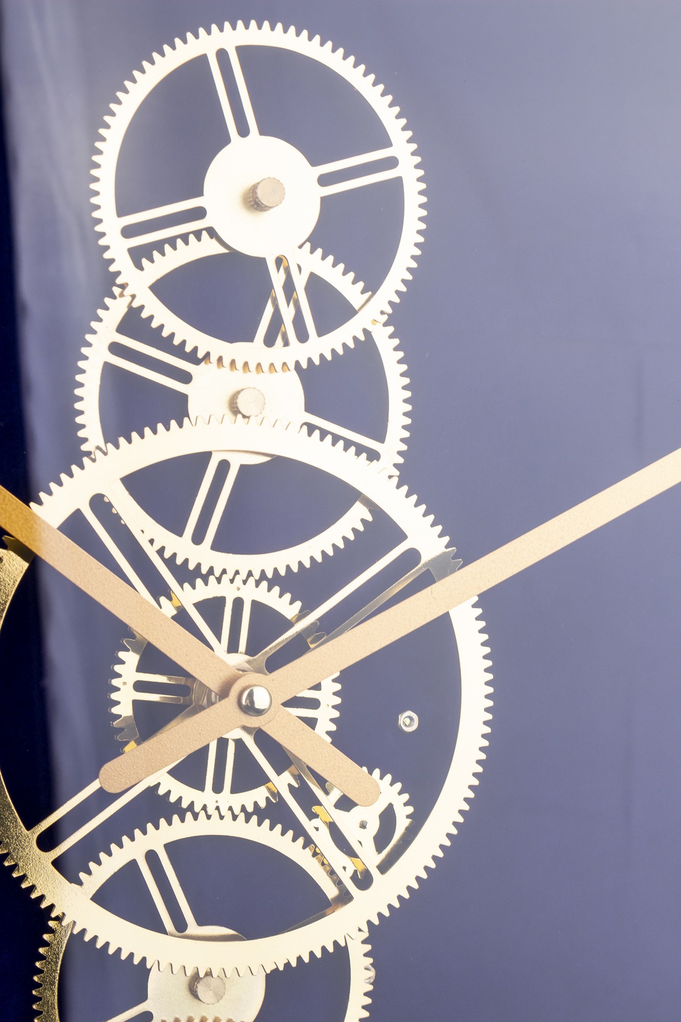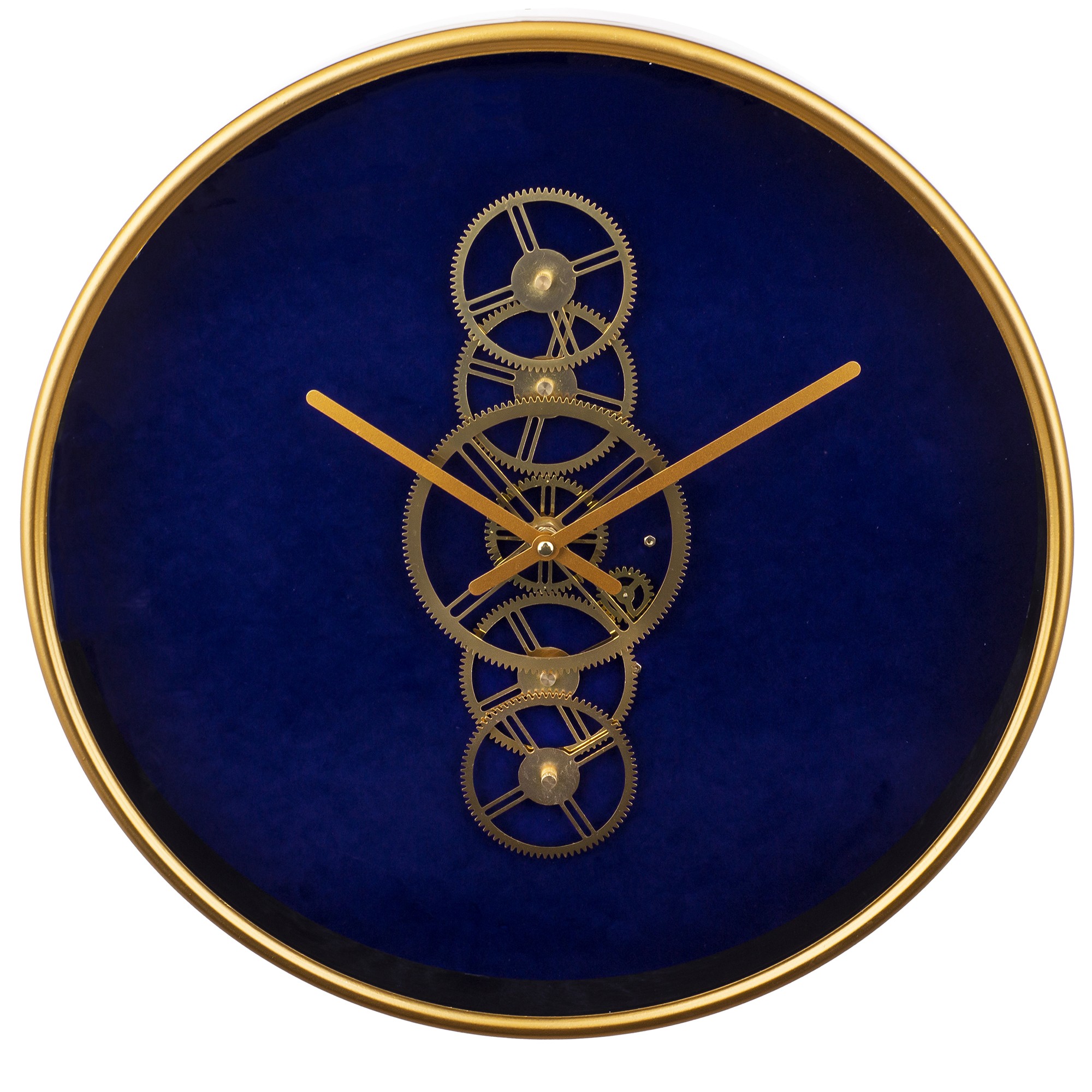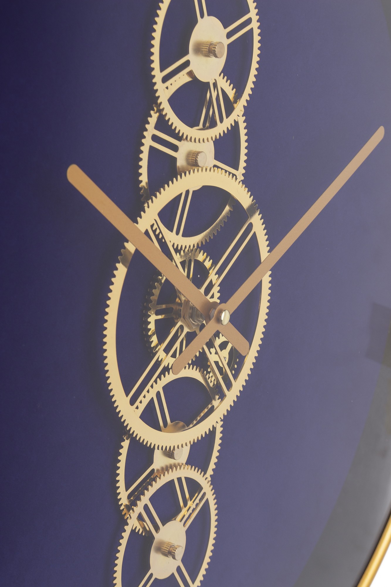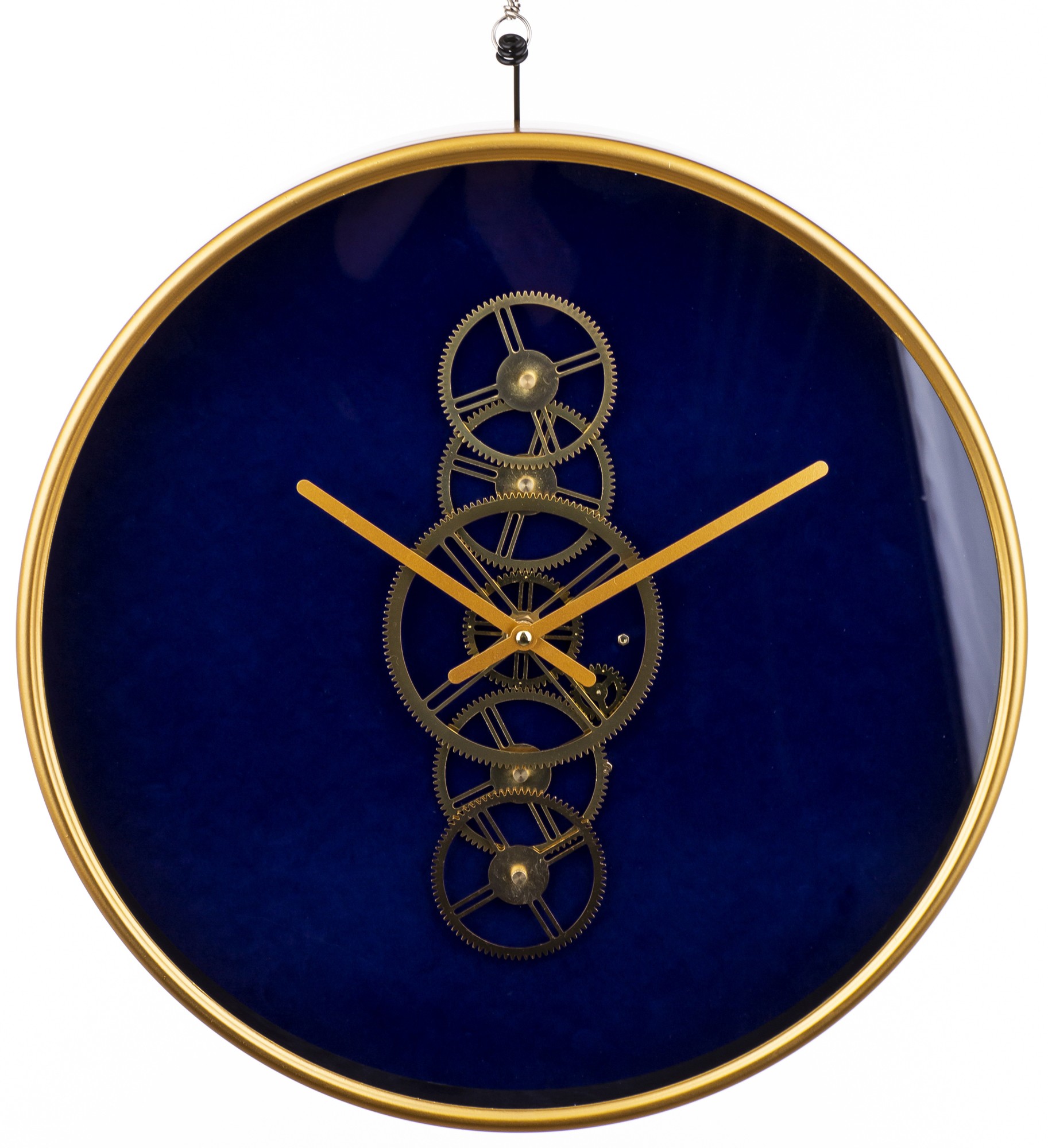 Tarcza zegara zawiera wyraźny mechanizm, co nadaje mu industrialnego charakteru. Piękne złote wskazówki doskonale kontrastują z głębokim granatem, nadając zegarowi ekskluzywny wygląd.