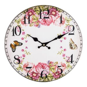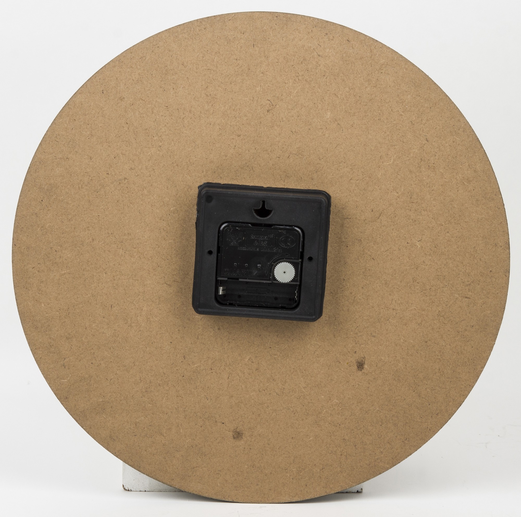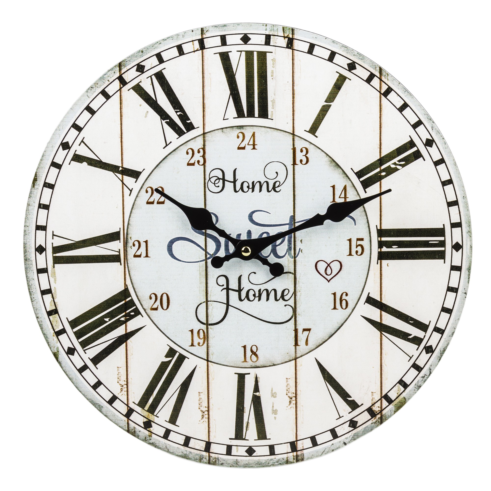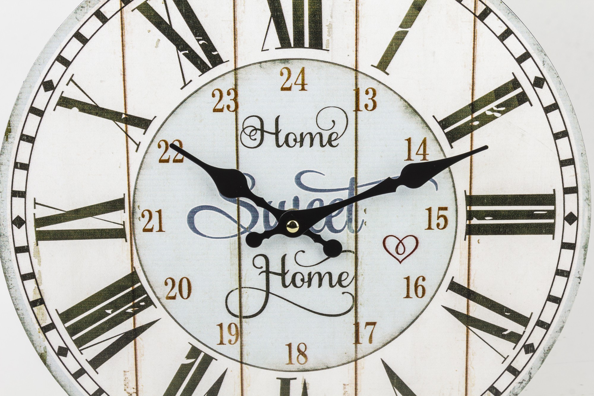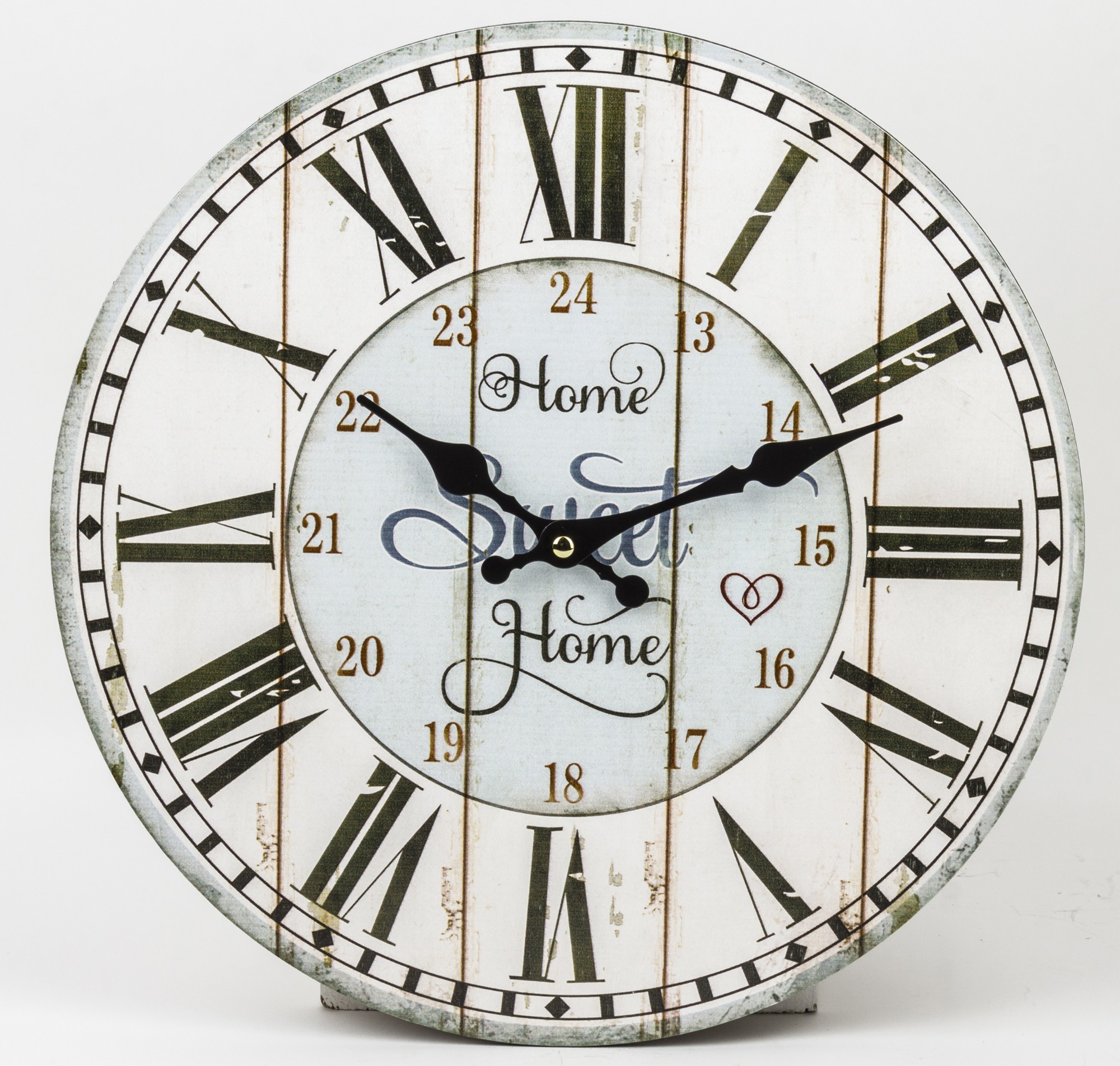 Zegar z płyty MDF, bez ramki, podzielony na dwa okręgi: zewnętrzny z dużymi czarnymi cyframi rzymskimi oznaczającymi godziny przedpołudniowe oraz wewnętrzny z mniejszymi cyframi arabskimi wskazującymi godziny popołudniowe. Na środku znajduje się ozdobny napis „Home sweet home”. Jasnobeżowa powierzchnia i ciemne napisy oraz cyfry zapewniają łatwość odczytu godziny mimo zdobień. Idealny do każdego wnętrza, dodając mu elegancji i stylu.